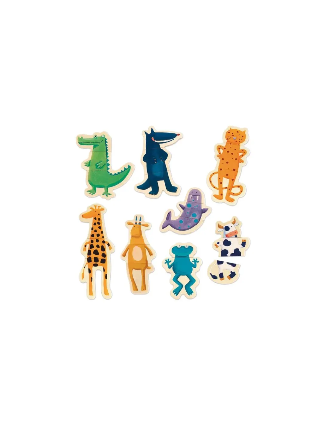 Le coffret contient 24 pièces magnétiques en bois permettant de créer 8 animaux de 3 pièces chacun. Votre enfant s’amusera à associer la tête, le corps et les pattes de chaque animal : une vache, un crocodile, une girafe, une grenouille, un loup…