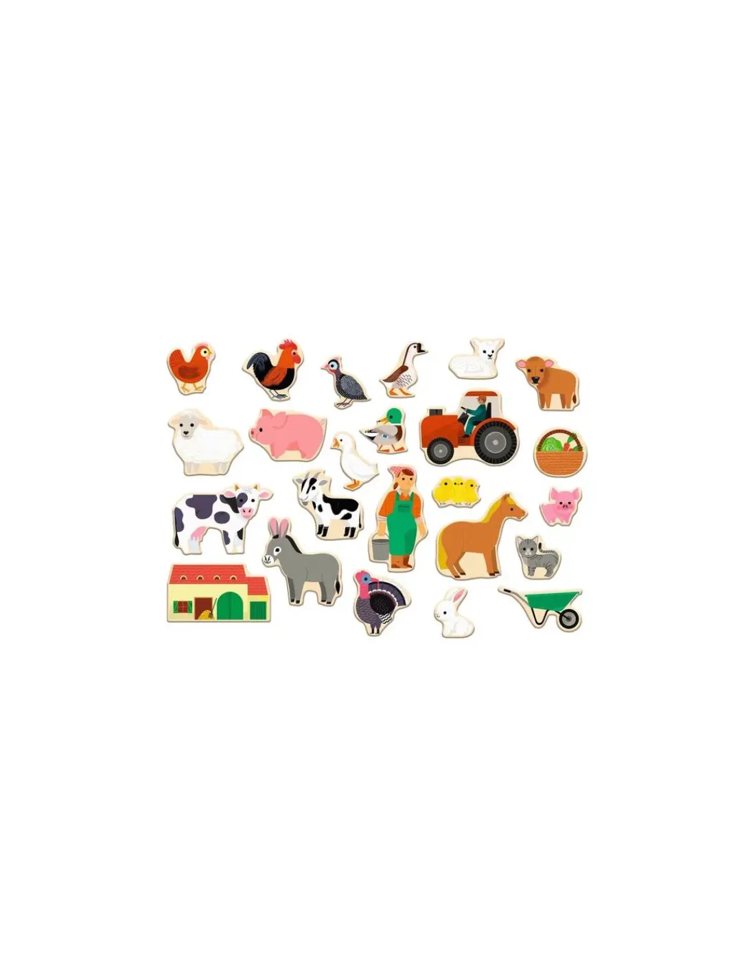 Un coffret de 24 pièces magnétiques en bois à placer sur un tableau magnétique ou sur un frigo, l’occasion d’échanger avec votre enfant sur le nom des animaux qu’il va découvrir. Une grange, un tracteur, une brouette, ainsi que de nombreux animaux, tels qu’une vache, un mouton, un cochon, une poule, un lapin… des animaux de la ferme pour amuser les enfants et pour inventer des histoires.