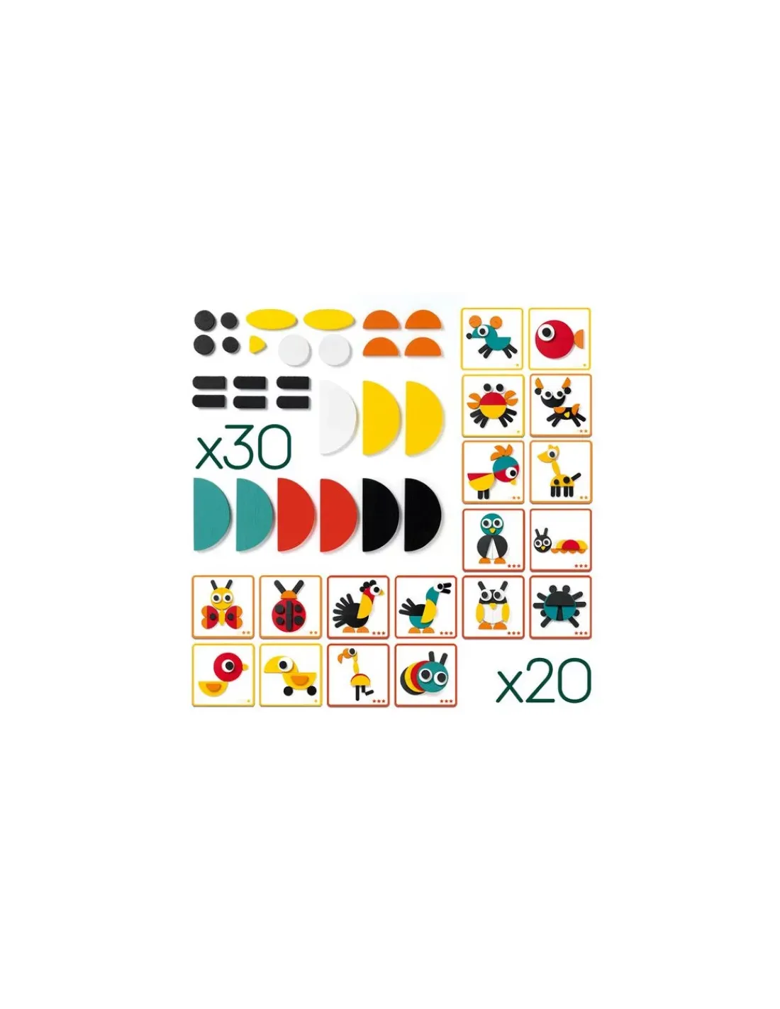 La boite contient 30 pièces en bois colorées de formes géométriques et 20 cartes modèle animaux avec 3 niveaux de difficulté signalés par des étoiles.