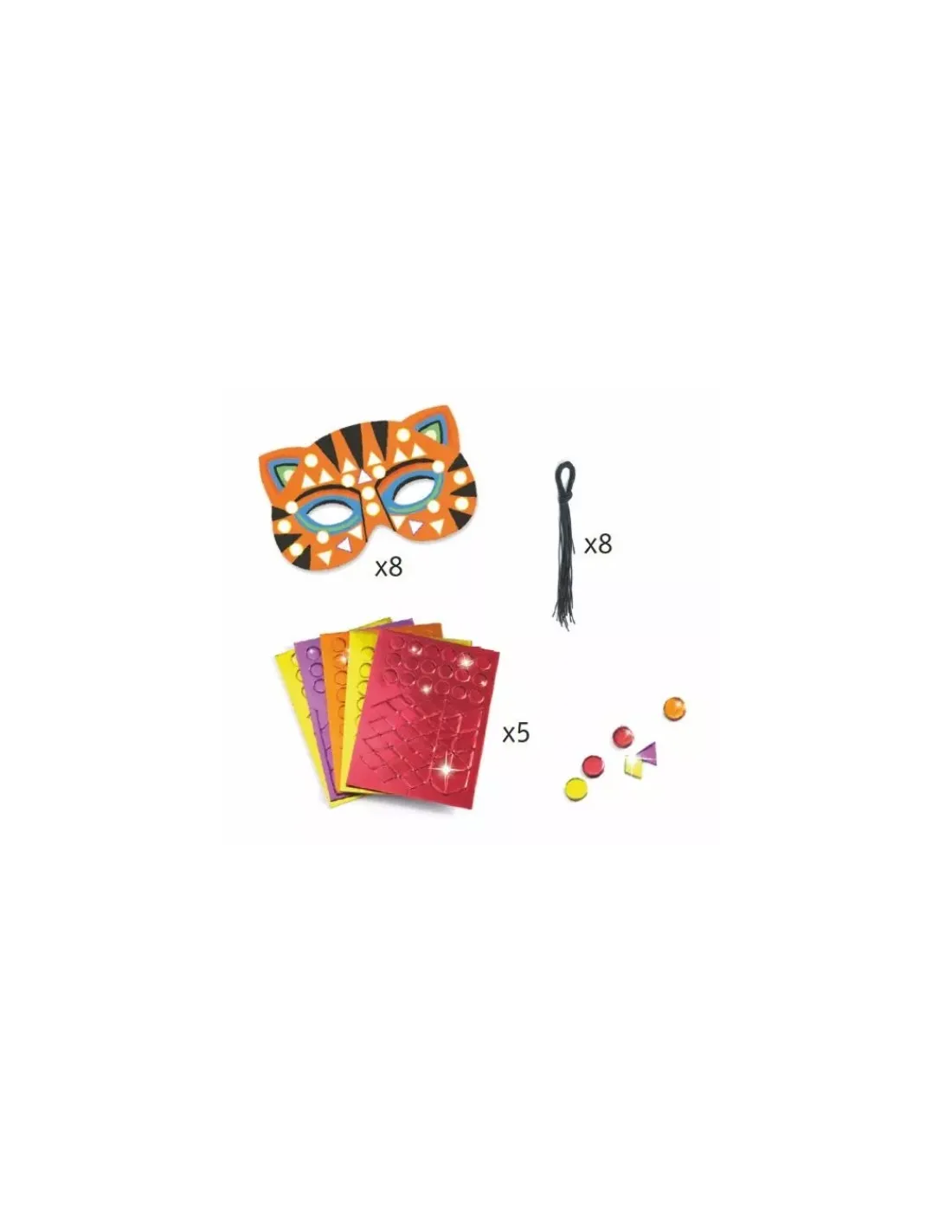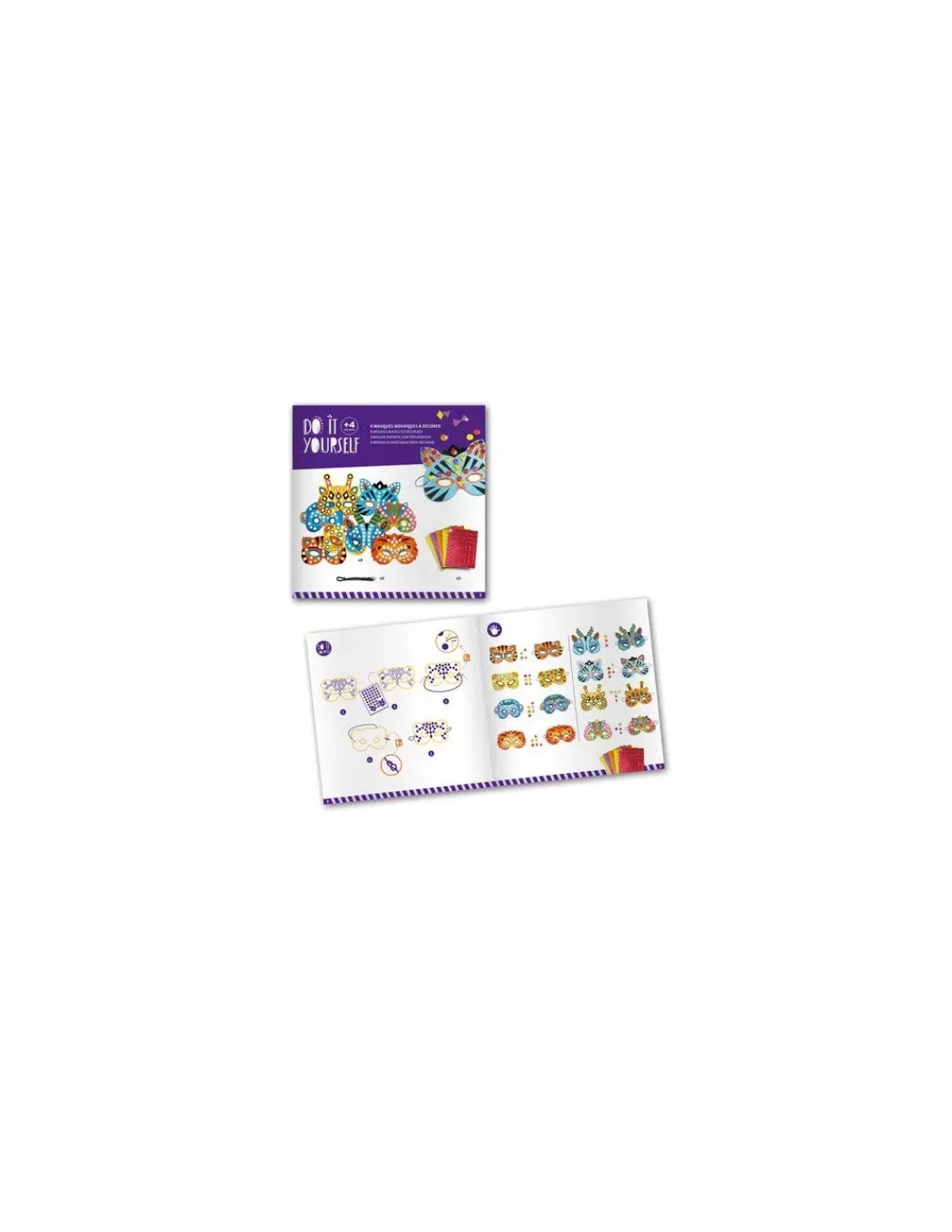La pochette comprend 8 masques, 8 élastiqes, 5 planches de mosaïques et une notice explicative.