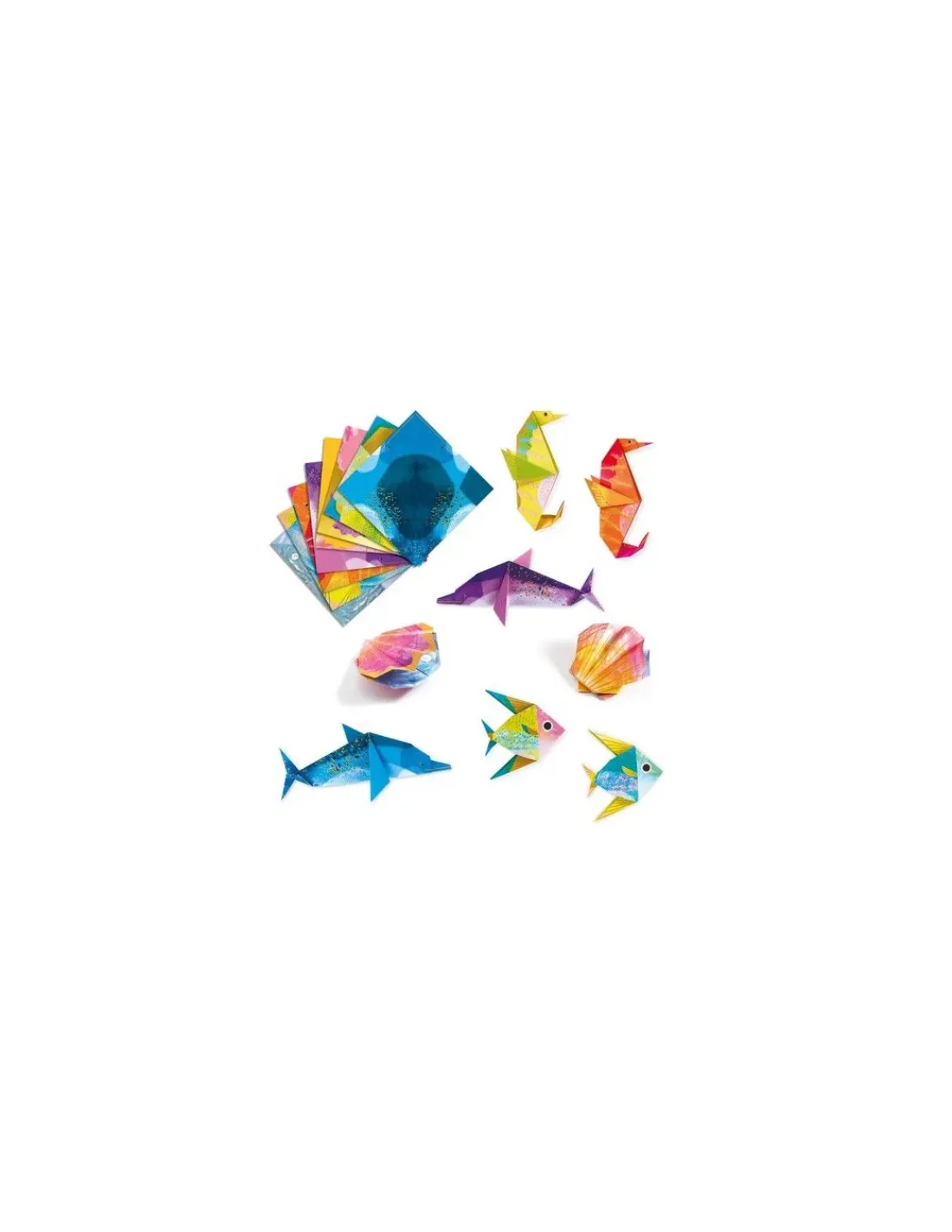 Découvrez la pochette origami animaux marins de Djeco pour les enfants à partir de 6 ans, une activité de pliage pour réaliser 24 créations aux effets métallisés représentant des animaux et des végétaux marins avec un hippocampe, un coquillage, un dauphin et un poisson.