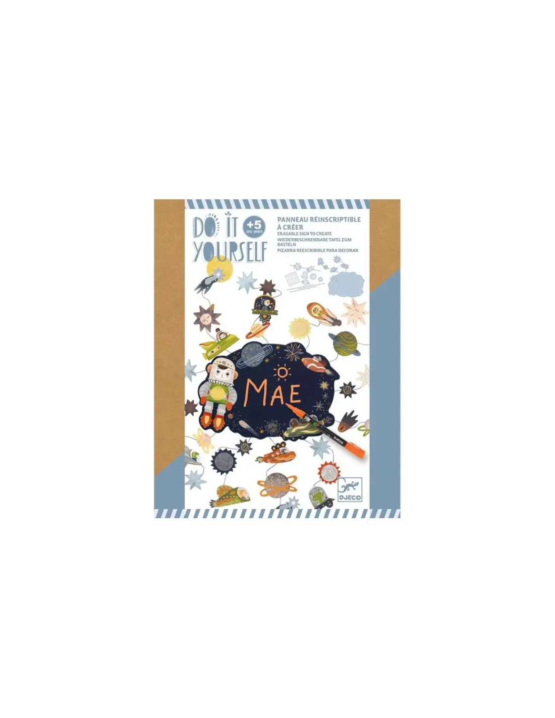 Découvrez le coffret Panneau réinscriptible à créer Dans les étoiles de la collection Do It Yourself de Djeco, un kit créatif permettant aux enfants, dès 5 ans, de confectionner un joli panneau effaçable sur le thème de l’Espace.