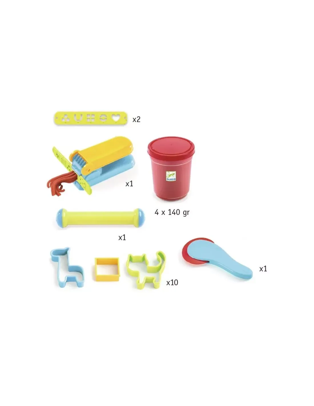 Ce set se compose de 4 pots de pâte à modeler (pot de 140 grammes) de couleur rouge, jaune, vert et bleu, 10 emporte-pièces, 1 rouleau, 1 roulette, de 2 barres de motifs et d’une presse.