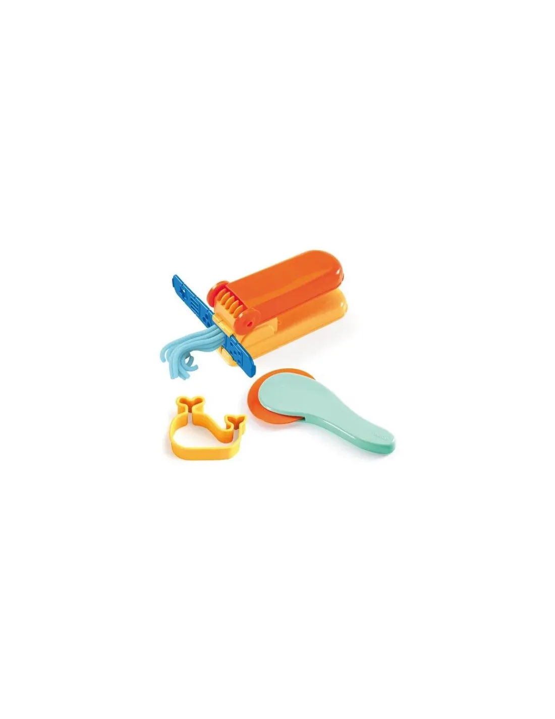 Ce set se compose de 4 pots de pâte à modeler (pot de 140 grammes) de couleur jaune, orange, bleu, vert, 10 emporte-pièces, 1 rouleau, 1 roulette, 2 barres de motifs et une presse.