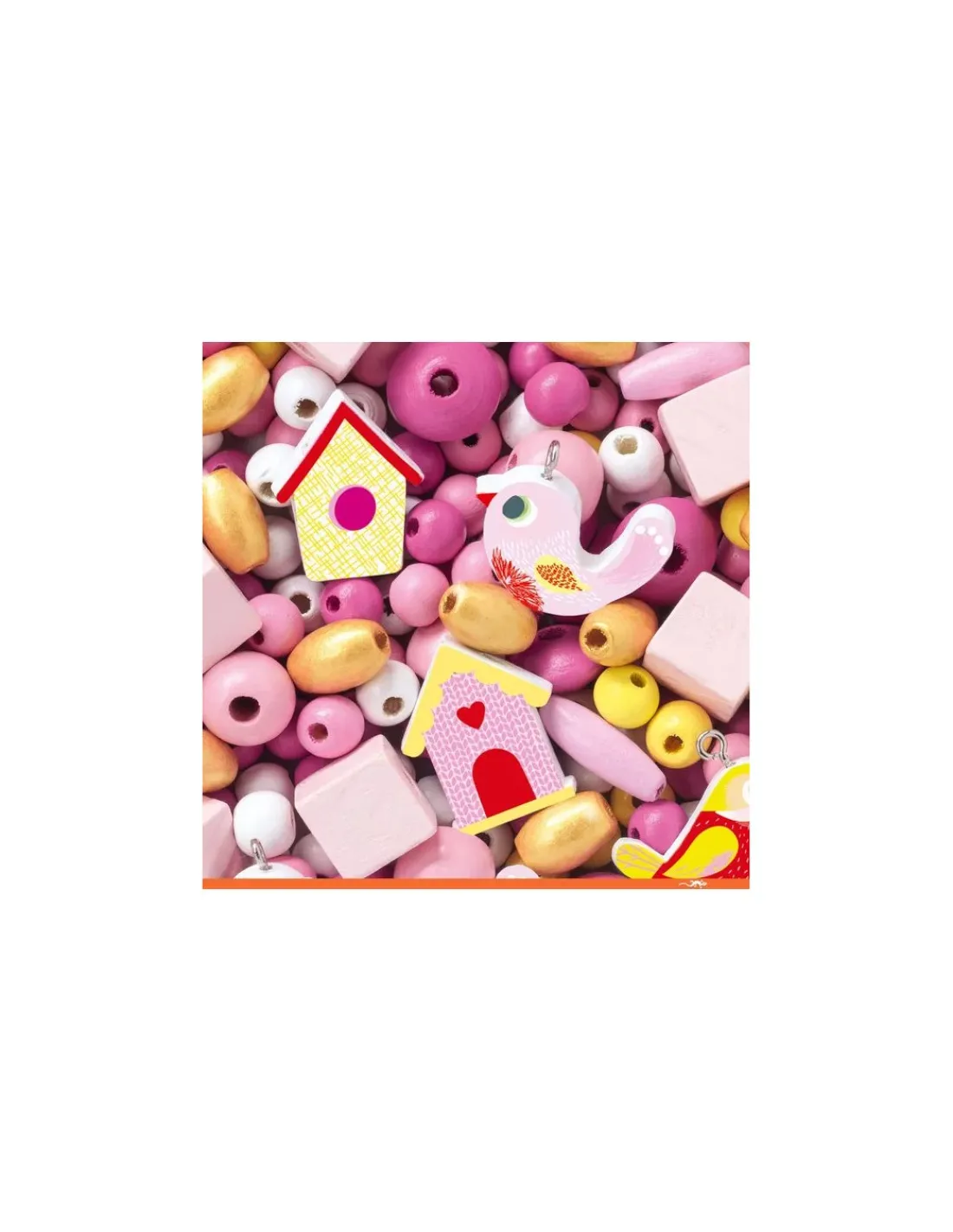 Ce coffret contient plus de 450 perles en bois dont des perles en forme d’oiseaux, de cabanes à oiseaux et 2 couleurs de fil.