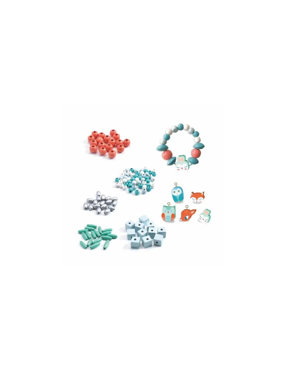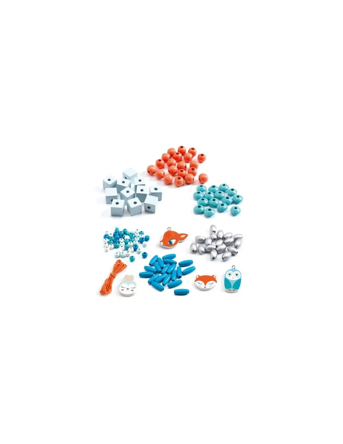 Ce coffret contient plus de 450 perles en bois dont des perles en forme de renard, chouette, lapin, faon…, et 2 couleurs de fil.