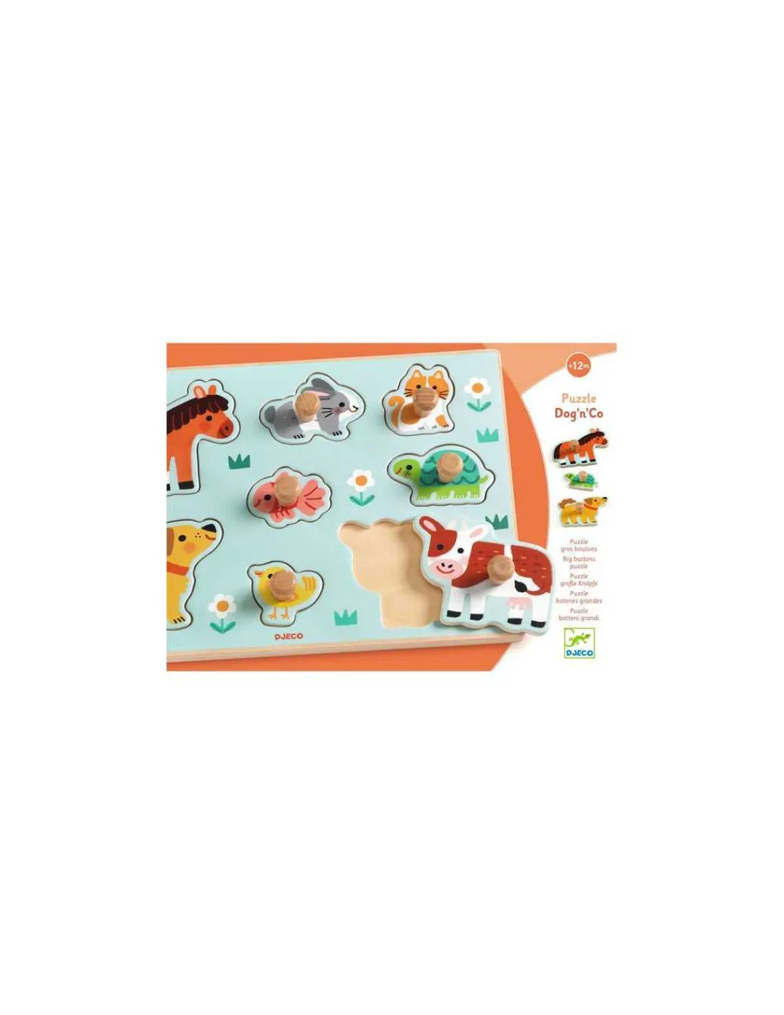 Découvrez le puzzle Dog’n’Co de Djeco, un superbe puzzle en bois de 8 pièces conçu pour les enfants dès 12 mois. Un joli puzzle à encaster sur le thème des animaux avec de gros boutons en bois pour que les petites mains puissent les attraper facilement.