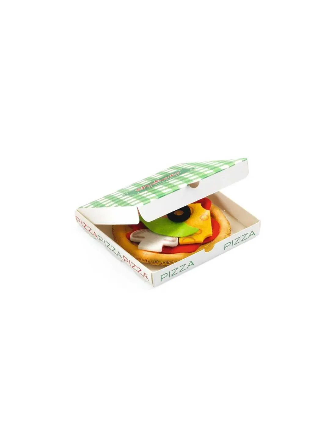 La boite contient 1 plateau en bois, 2 pâtes à pizza en tissu suédine, 2 fonds de sauce tomate et 10 accessoires en feutrine, 2 boîtes de livraison en carton et une boîte four en bois.