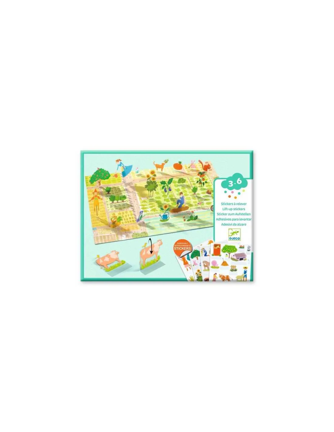 L’enfant colle les stickers sur les grandes images, puis les relève un à un… pour créer des scènes en volume, et s’inventer des histoires sur le thème de la campagne : tracteur, animaux de la ferme, jardin potager…