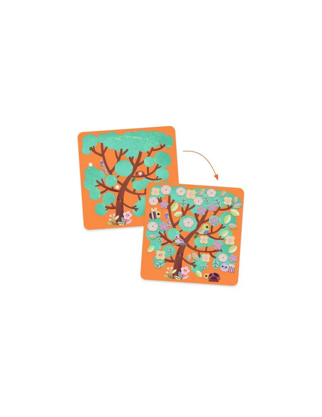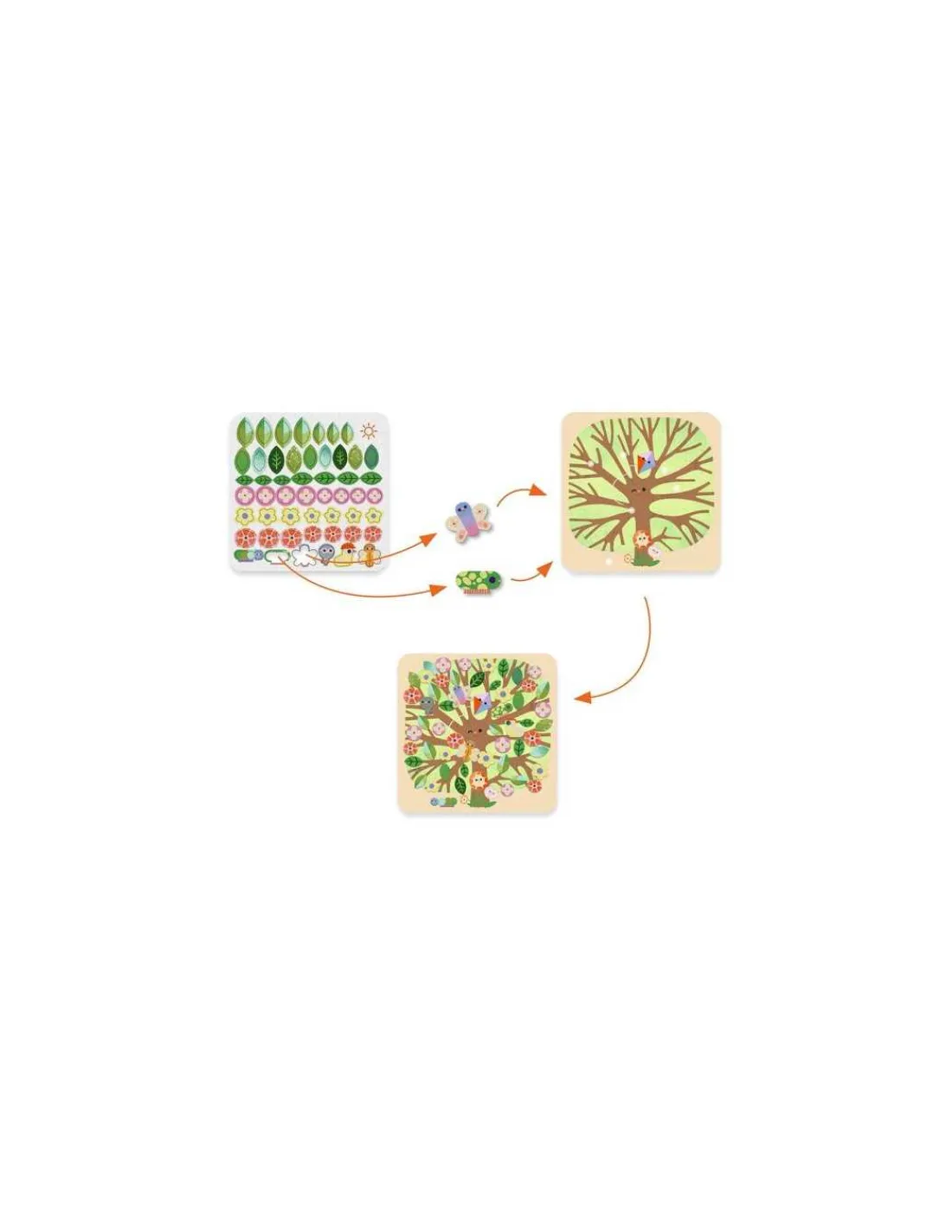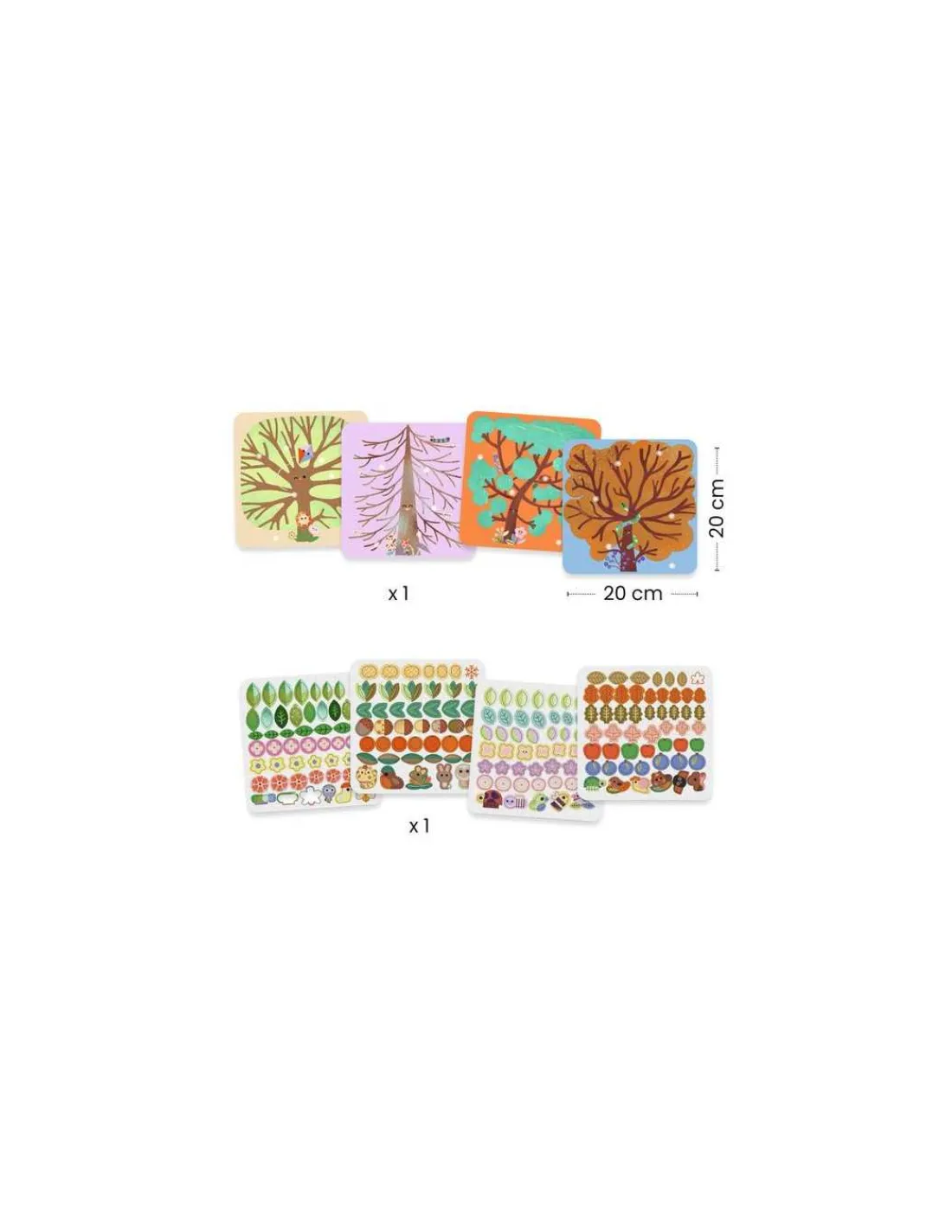 Votre enfant va s’amuser à animer les 4 tableaux représentant des arbres en collant de la douce feutrine. Les positions de départ des plus grandes pièces sont clairement indiquées, pour garantir une parfaite réussite dans le placement des autocollants sur le tableau.