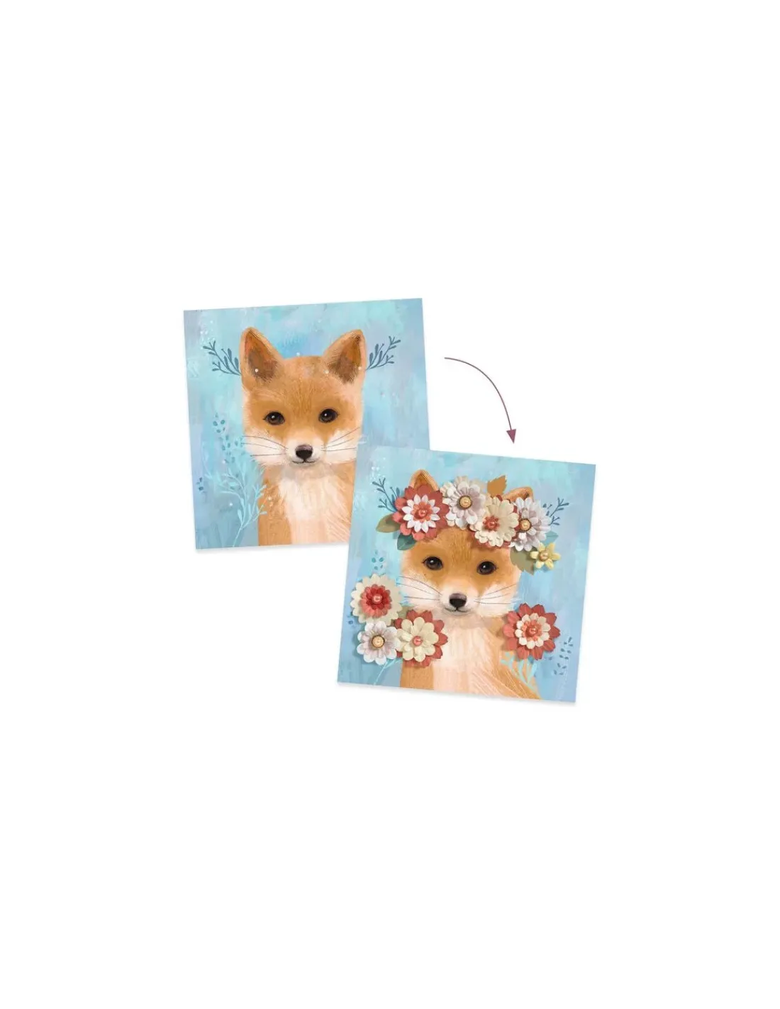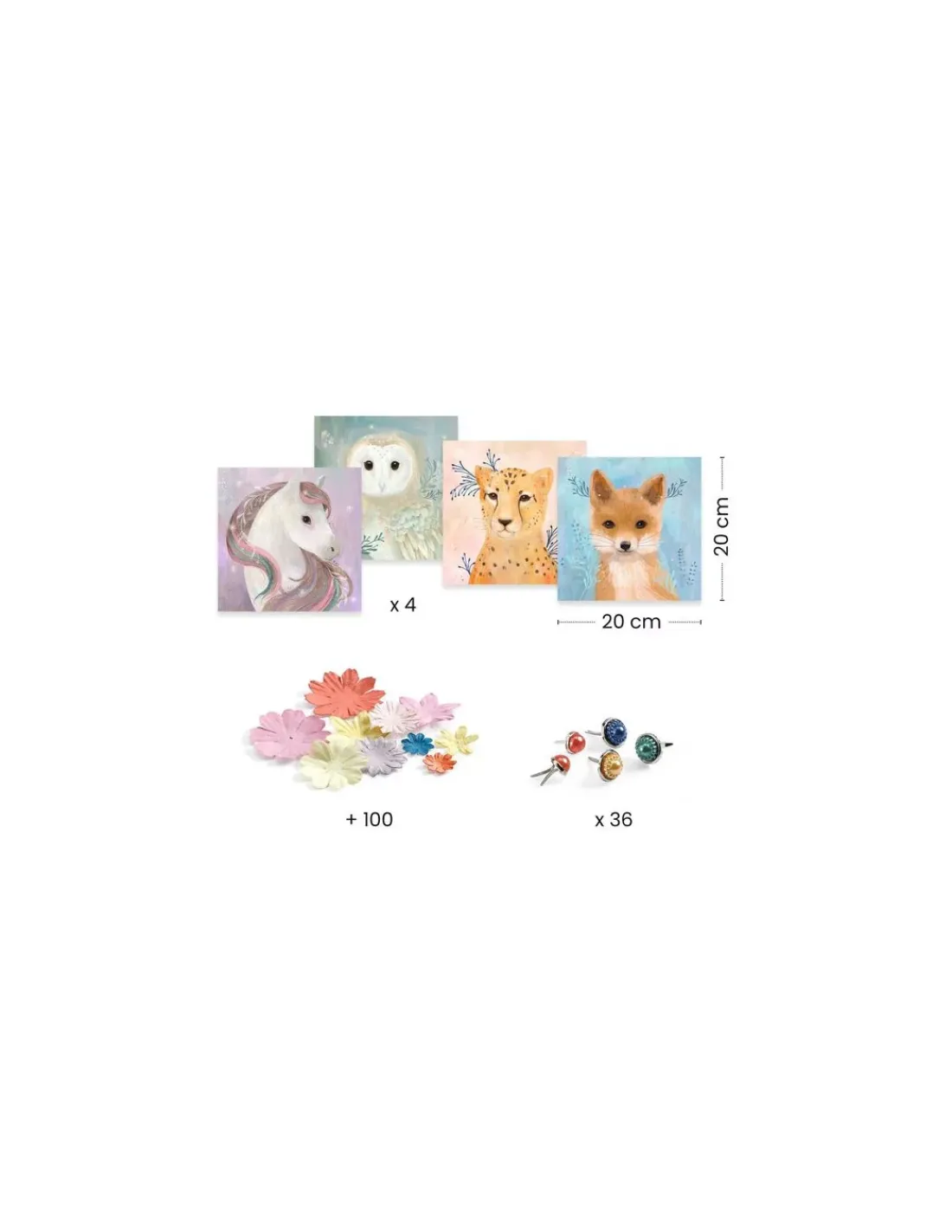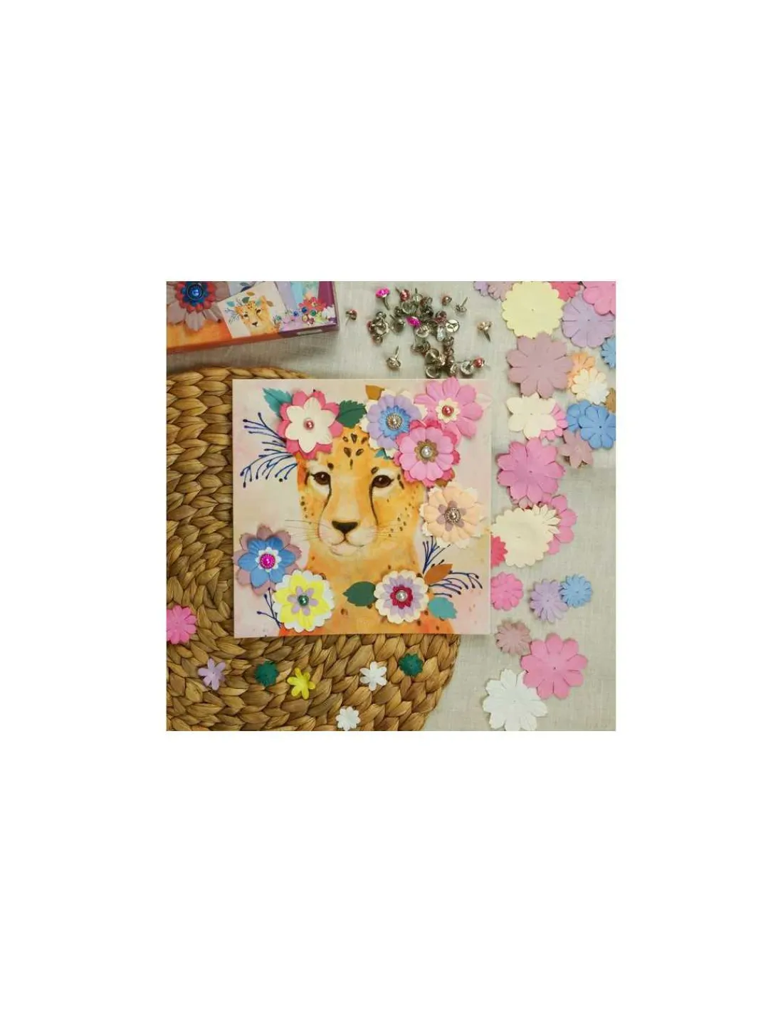 Un loisir créatif à réaliser pas à pas avec une multitude de corolles de papier, que votre enfant s’amusera à assembler facilement grâce aux jolies attaches parisiennes nacrées. De magnifiques couronnes de fleurs coiffent la tête des animaux : un renard, une licorne, une chouette et un guépard.