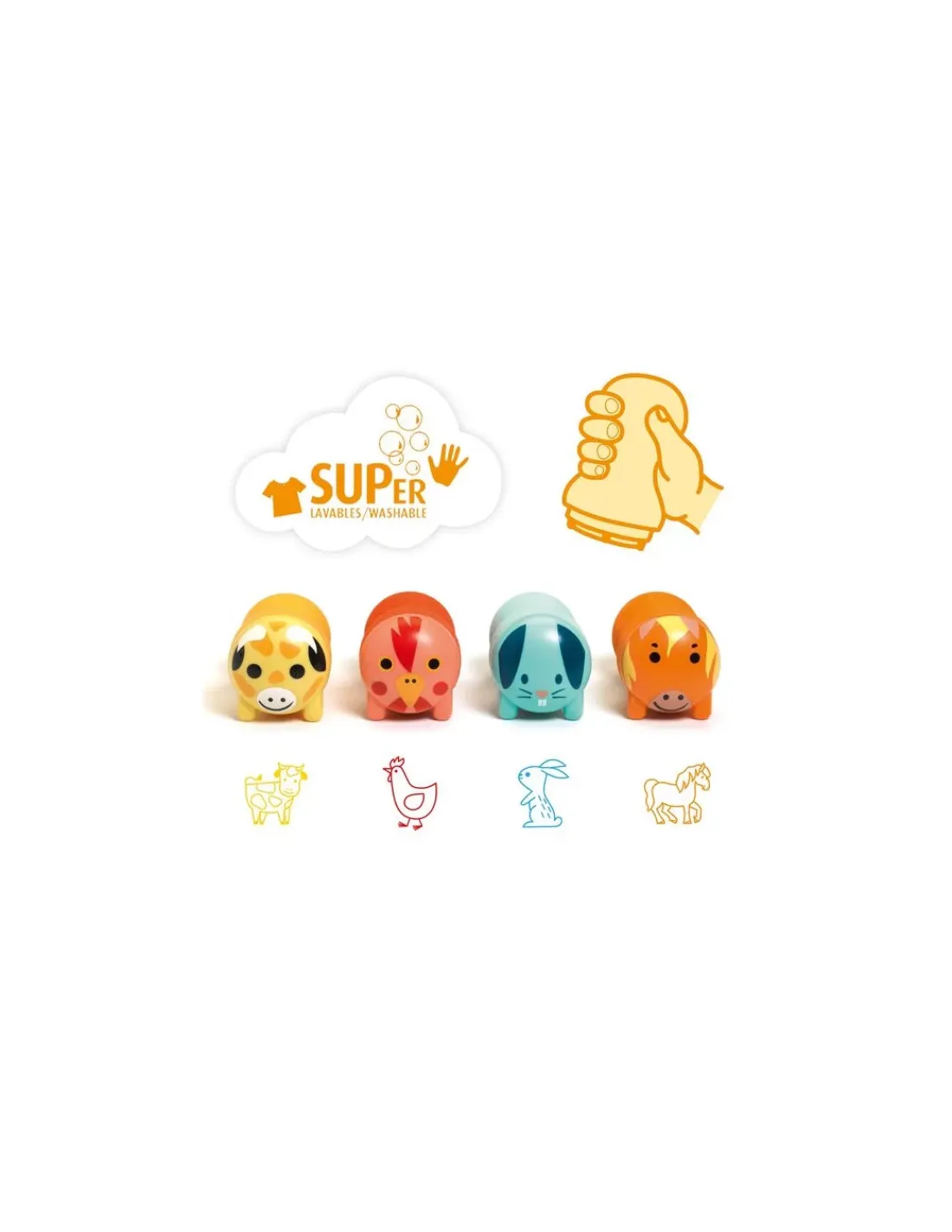 Découvrez les tampons animaux de la ferme de Djeco, 4 tampons pour les enfants à partir de 18 mois. Des tampons ergonomiques et auto-encreurs avec une poignée en mousse spécialement adaptés pour les petites mains. Votre enfant va pouvoir tamponner des poules, des lapins, des vaches et des chevaux sur ses cahiers ou ses feuilles de dessin.