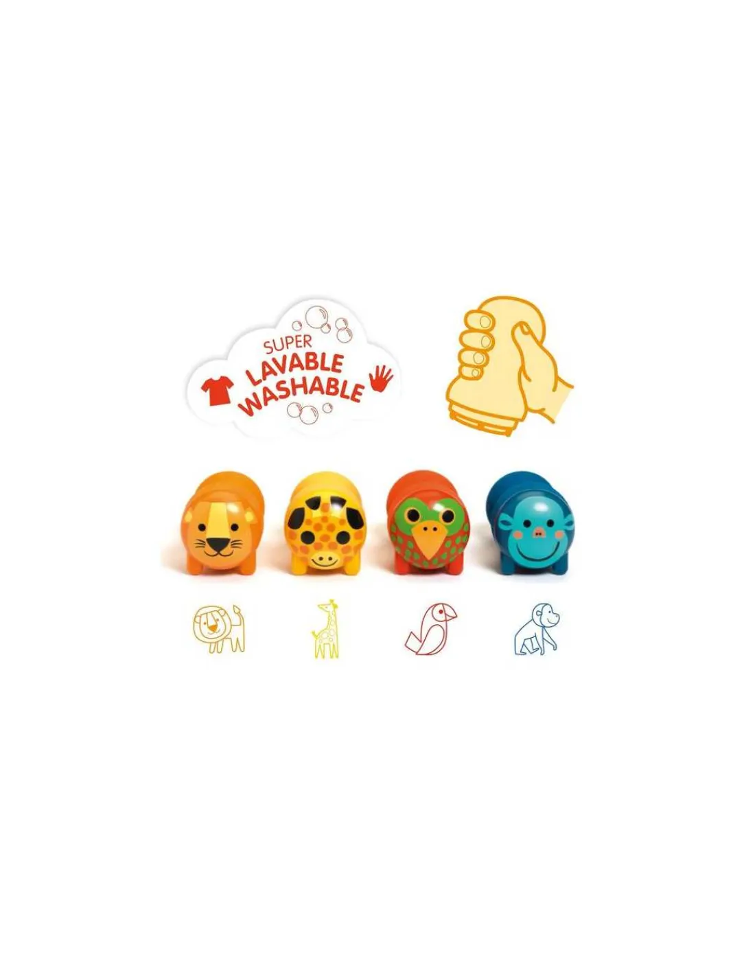 Le coffret comprend 4 tampons ergonomiques auto-encreurs: girafe = jaune, lion = orange, singe = bleu et perroquet = rouge.