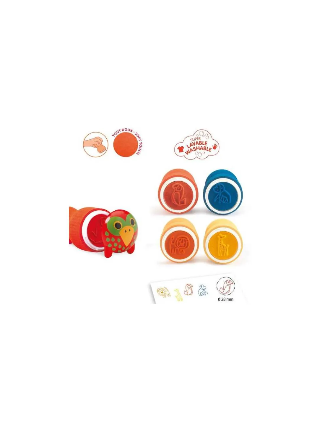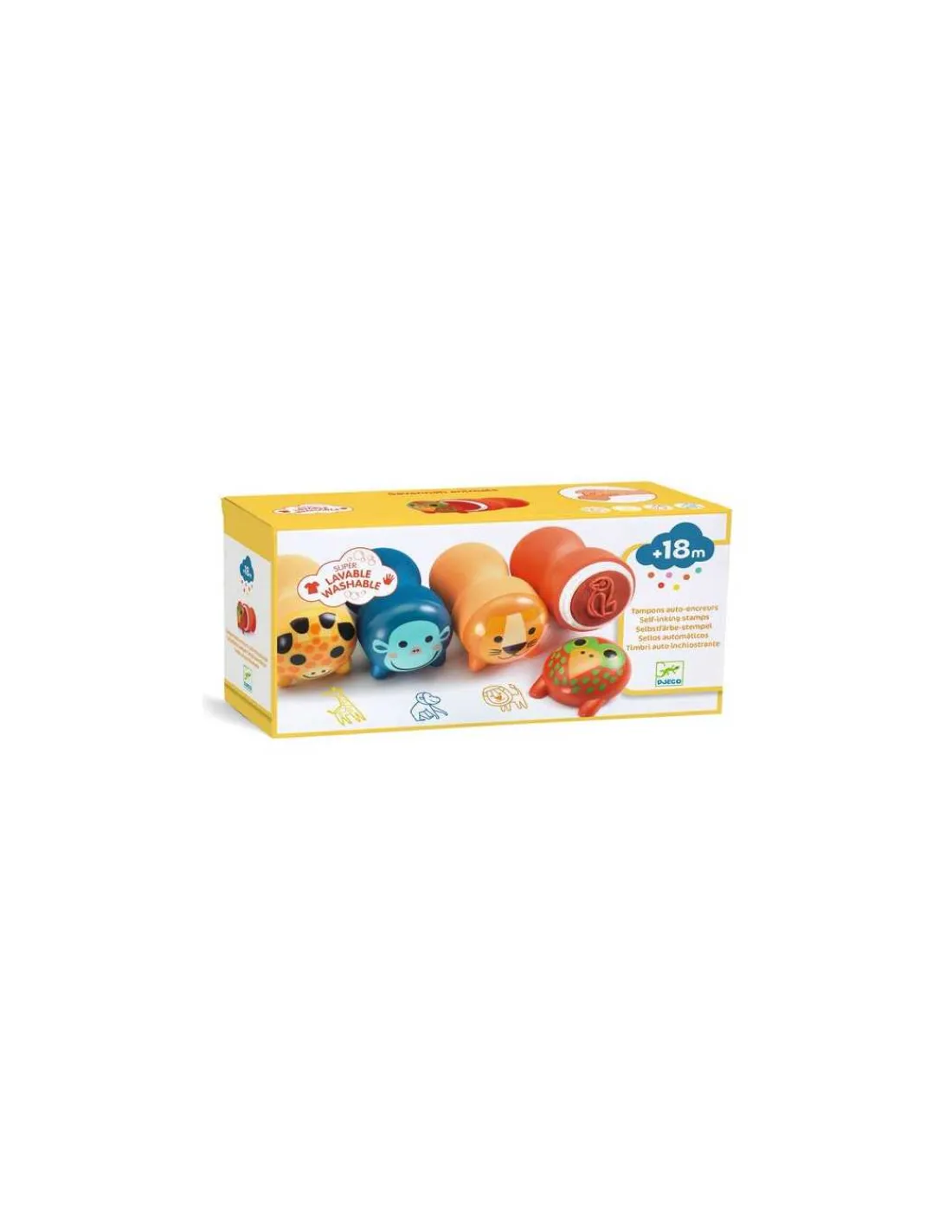Découvrez les tampons animaux de la savane de Djeco, 4 tampons pour les enfants à partir de 18 mois. Des tampons ergonomiques et auto-encreurs avec une poignée en mousse spécialement adaptés pour les petites mains. Votre enfant va pouvoir tamponner des perroquets, des singes, des girafes ou des lions sur ses cahiers ou ses feuilles de dessin.