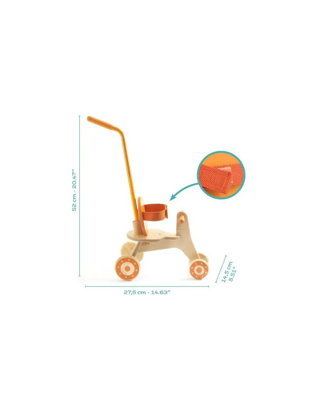 Découvrez le tricycle de la collection Pomea de Djeco, un mini porteur pour poupée adapté à la taille des poupons de 30 à 36 cm. Un jouet en bois à offrir aux enfants qui aiment jouer à la poupée dès 2 ans.