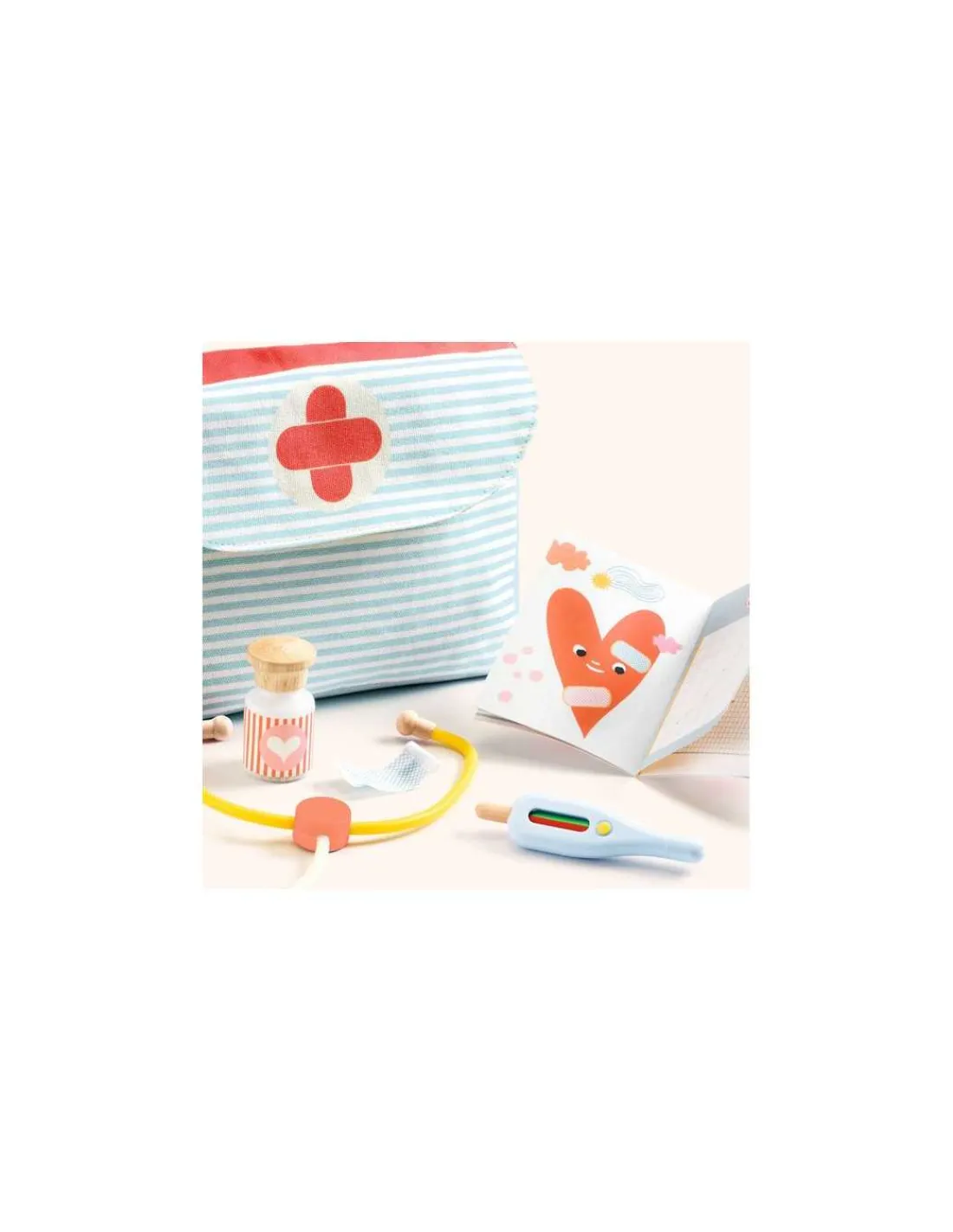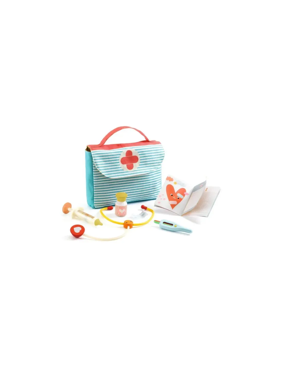 Ce jouet se compose d’une valisette en tissu, 1 thermomètre, 1 stétoscope, 1 seringue, 1 flacon de médicaments, 1 pansement et 1 carnet de santé.