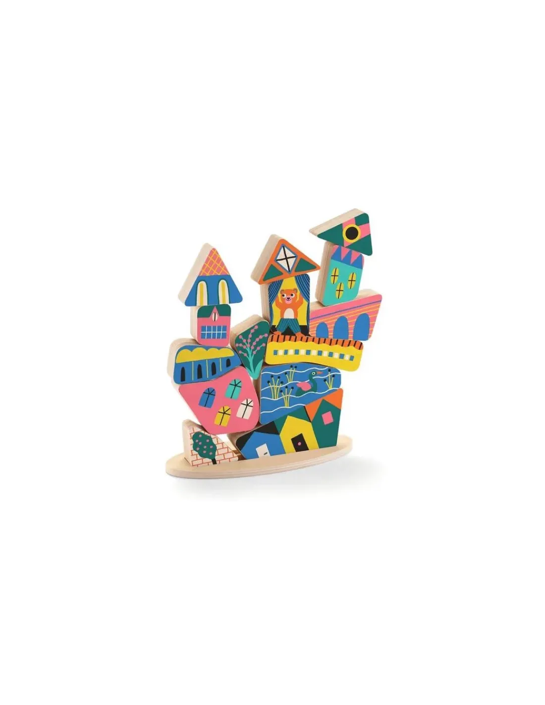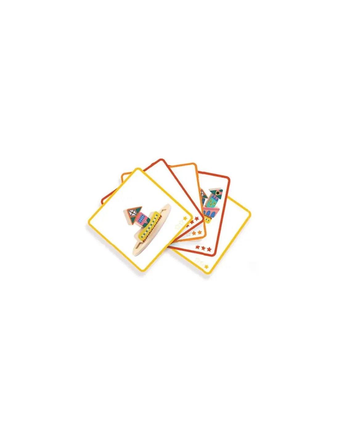 Ce jeu de construction est composé de pièces en bois colorées et de 20 modèles de 3 niveaux de difficulté signalés par des étoiles. Votre enfant devra empiler les pièces dans le but de réaliser la construction présente sur le modèle… gare à la pièce mal placée qui fera tout tomber! Une base en bois aidera l’enfant à commencer les constructions.