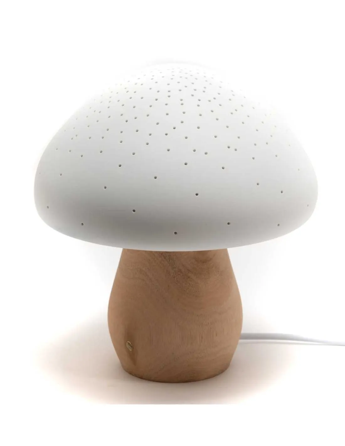 Découvrez la lampe champignon en porcelaine de Amadeus Les Petits, une douce veilleuse ajourée avec un pied en bois pour décorer la chambre et apaiser les nuits de bébé en diffusant une douce lumière. Sa lumière douce et réconfortante apportera une touche cosy et une originalité singulière.