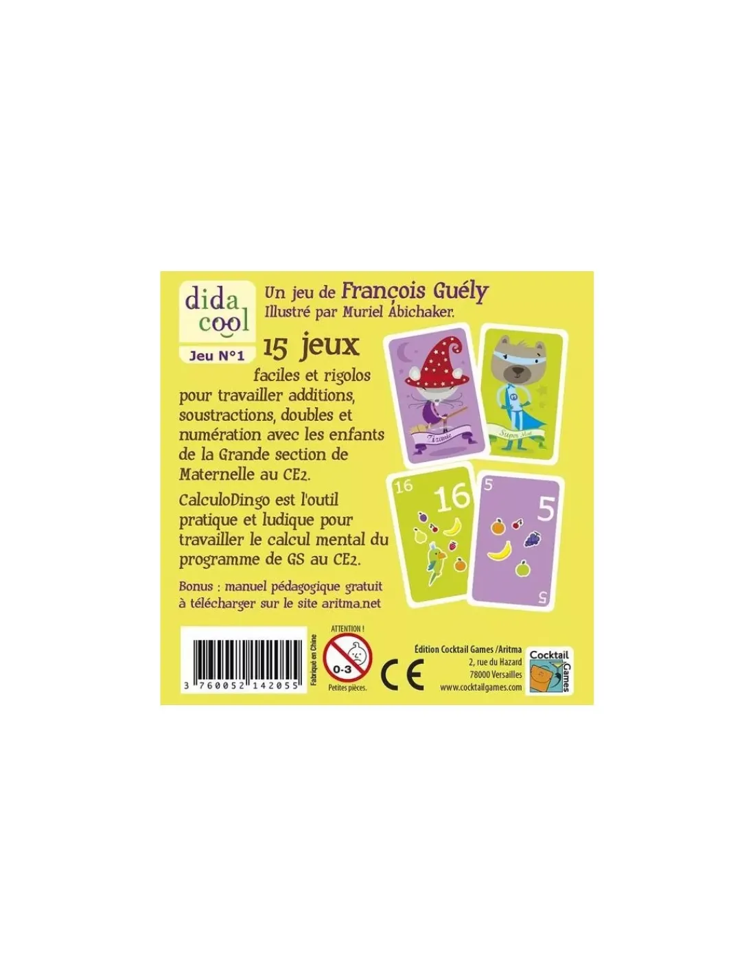 Découvrez le jeu Calculodingo de Cocktail Games, un jeu de cartes éducatif à partir de la Grande Section pour travailler la numération, les additions, les soustractions et les doubles.