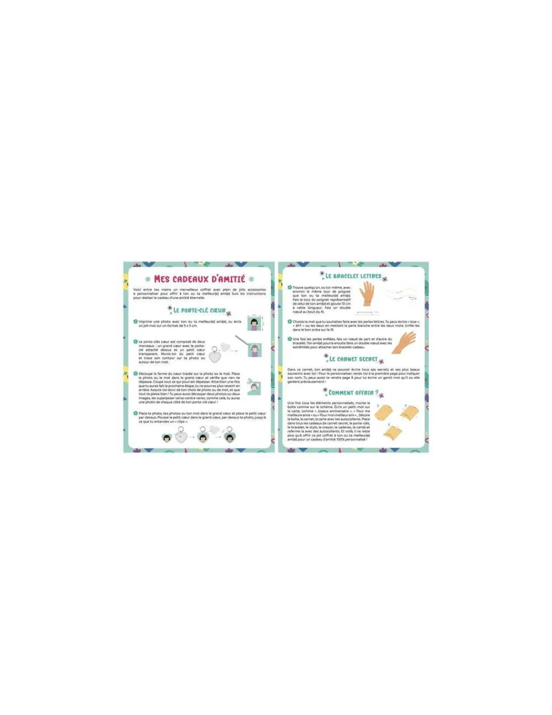 Le coffret comprend un carnet secret, un stylo et un crayon, un bracelet à fabriquer, un porte clé à monter, un coffret cadeau, une jolie carte, des autocollants et une fiche explicative.