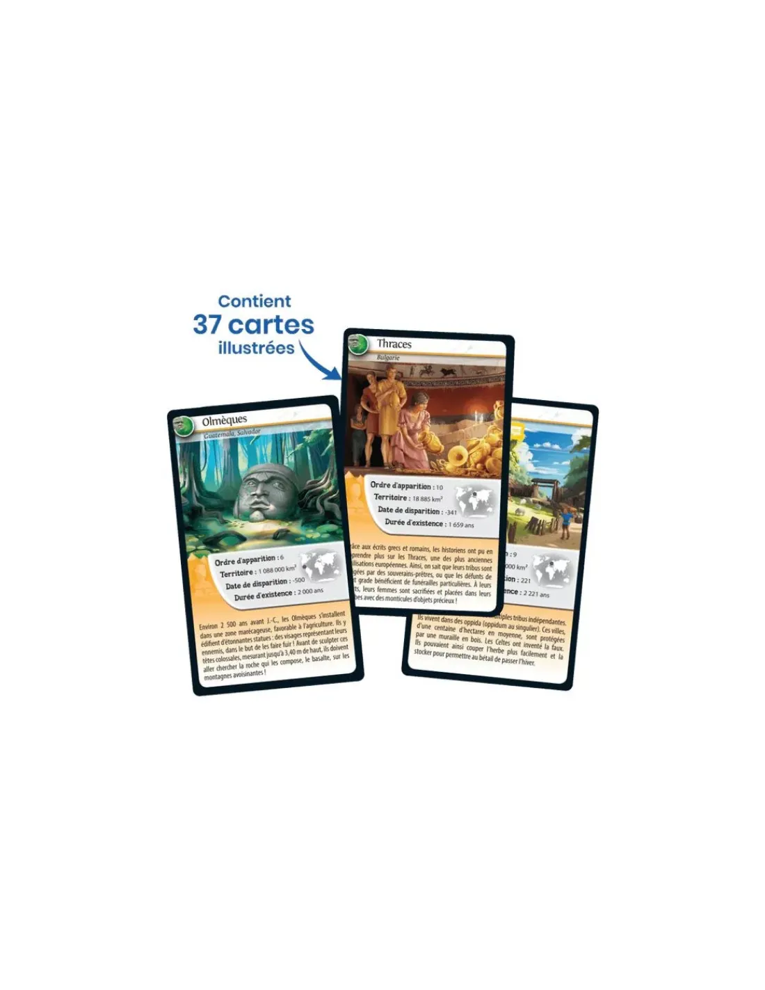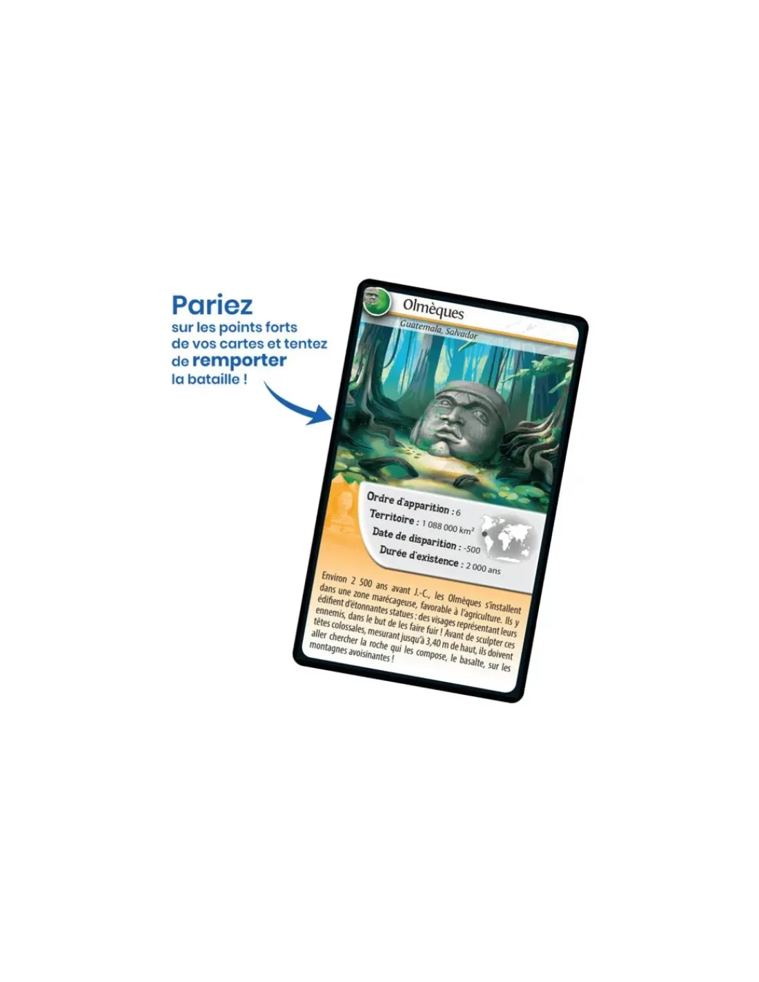 Découvrez les civilisations, pariez sur les points forts de vos civilisations pour collecter toutes les cartes du jeu et remporter la partie. Saurez-vous identifier la caractéristique qui vous semble la plus forte pour gagner la manche et remporter les cartes des autres joueurs? Le premier joueur qui collecte toutes les cartes du jeu remporte la partie!