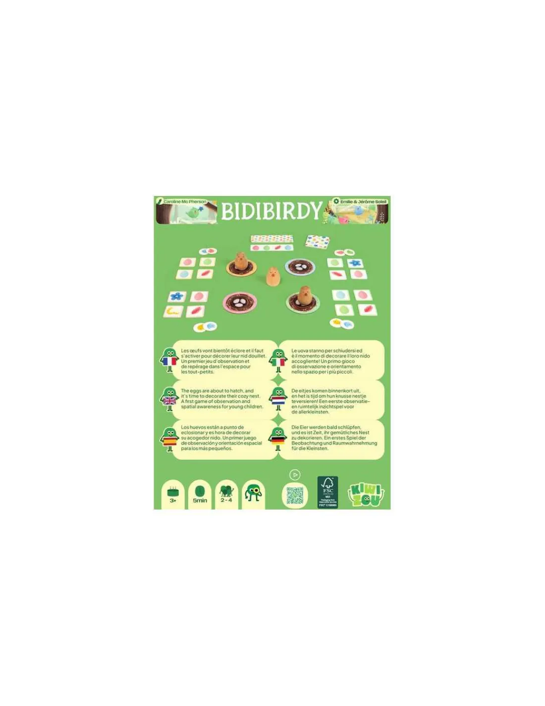 Découvrez le jeu Bidibirdy de Kiwizou, un premier jeu d’observation et d’association pour jouer en famille de 2 à 4 joueurs à partir de 3 ans. Un joli jeu de société dans lequel vous incarnez un oiseau dont les oeufs vont bientôt éclore. Vous devrez faire preuve d’observation et de rapidité pour décorer vos nids avant les autres.