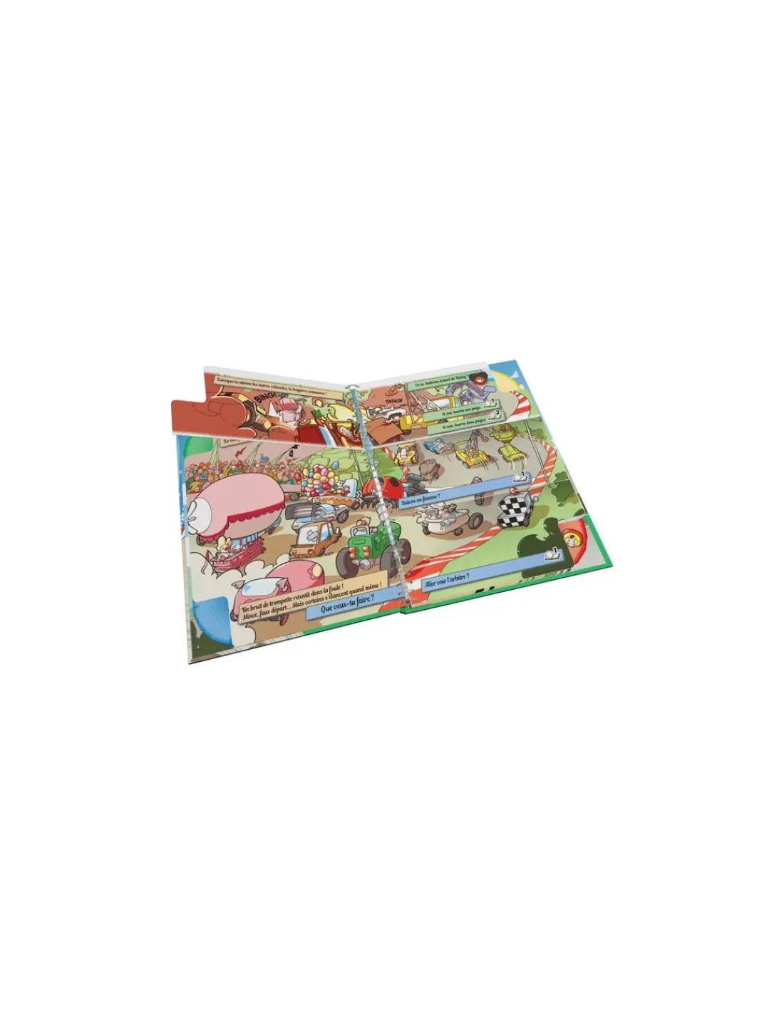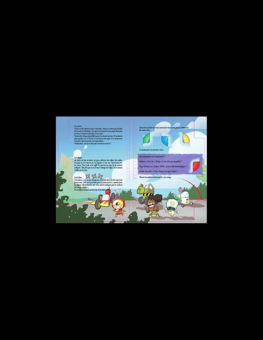 Ouvre le livre et choisis ton pilote et son véhicule : Ambrose à bord de Tanky, son char blindé. Bip-Bop, dans sa Futuro-Mobile, la merveille technologique. Ou Haru et son Éclair Rouge, le super bolide ! Et maintenant, la course peut commencer.