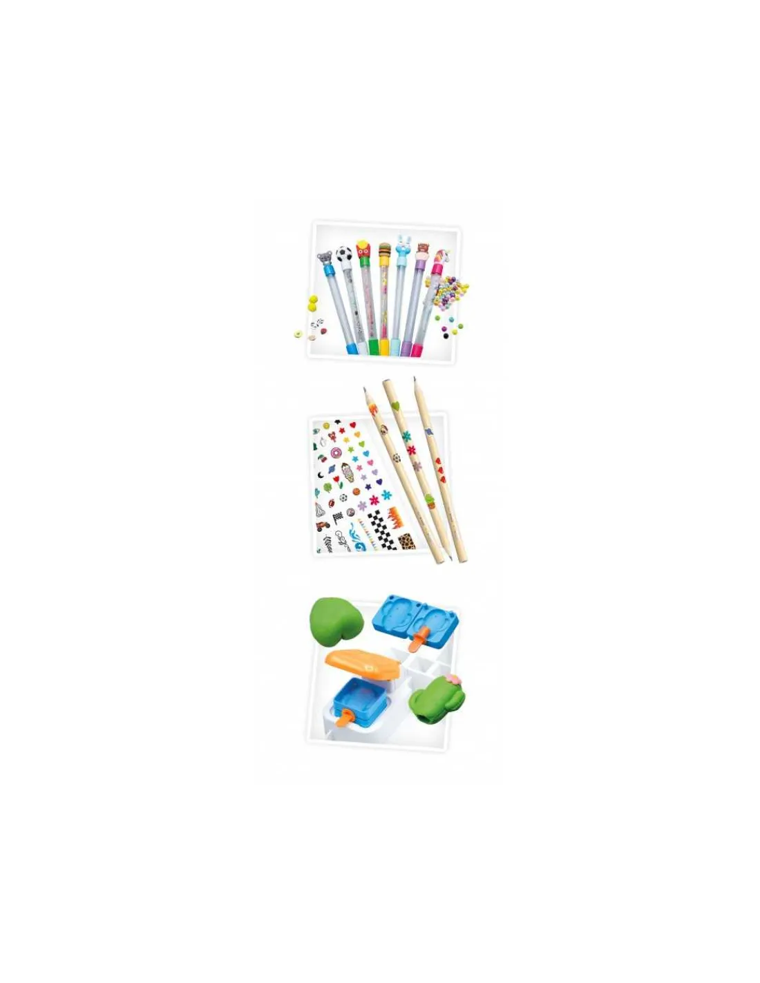 Avec cette station, il suffit de placer le stylo à personnaliser, d’ajouter l’entonnoir et de le remplir avec les décorations de son choix pour un look unique. Votre enfant pourra décorer les crayons à papier avec des stickers colorés et fabriquer des gommes amusantes à partir de 5 couleurs de pâte à gomme, en utilisant les 3 moules fournis ou en les modelant lui-même.
