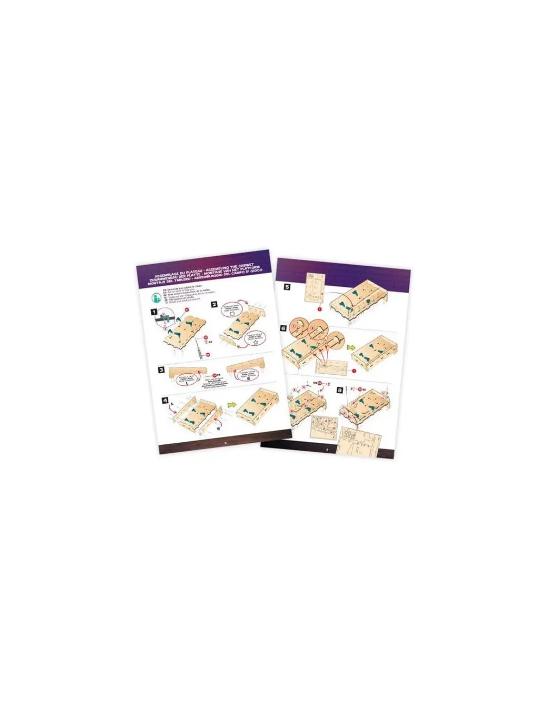 Le coffret comprend 4 planches de bois, 1 scoreur électronique, 1 haut-parleur, 1 compartiment à piles, 4 supports bumpers, 4 ressorts, 2 LEDs vertes, 2 LEDs bleues, 4 batteurs, 1 bouton long, 1 bouton court, 1 lanceur, 1 grand ressort, 4 patins anti-dérapants, 2 billes, 4 grands joints, 1 petit joint, 1 adhésif, 4 élastiques, 2 élastiques rouges, 18 vis à collerettes, 4 grandes vis, 2 vis moyennes et 2 écrous, 15 petites vis, 1 tournevis et 1 planche d’autocollants.