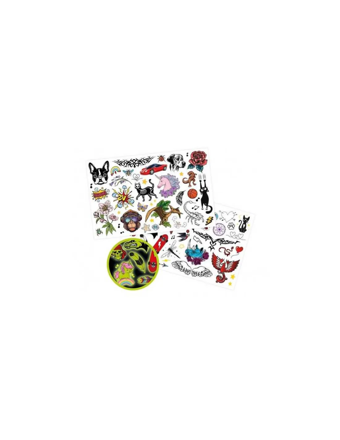 4 planches de tatouages temporaires sont également fournies pour des tattoos colorées et phosphorescents. L’encre, les feutres et les tatouages temporaires s’effacent au bout de quelques jours en se lavant, ou avec du démaquillant selon les tatouages et types de peau.
