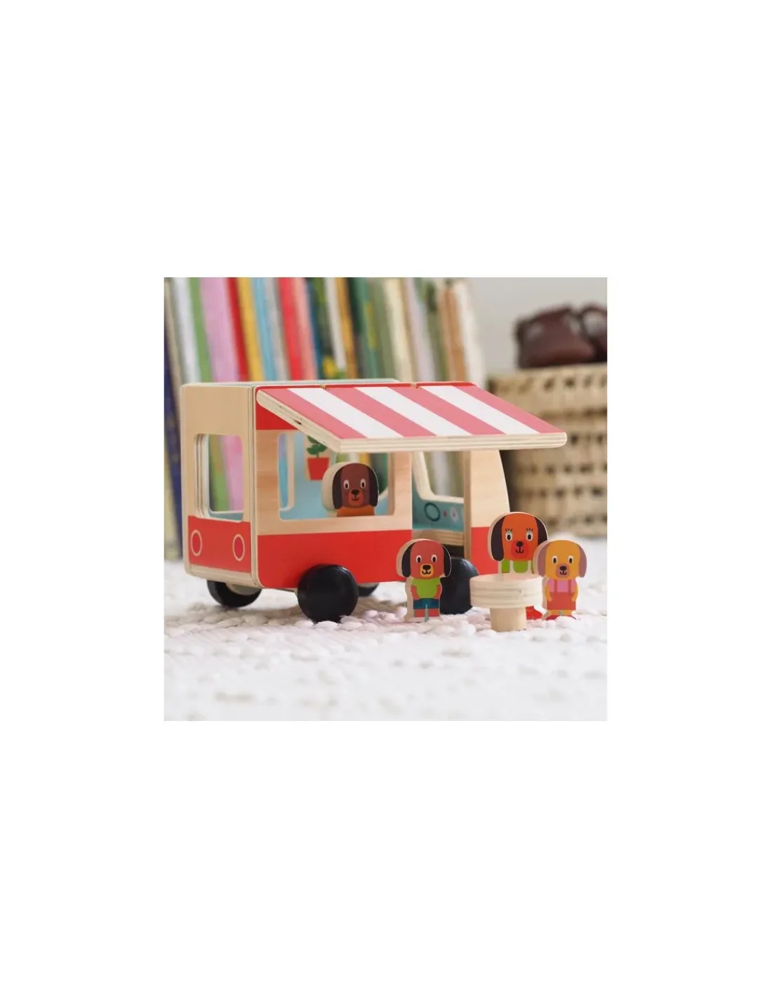 Ce cadeau en bois FSC comprend 1 camping car, 4 figurines et 1 table.