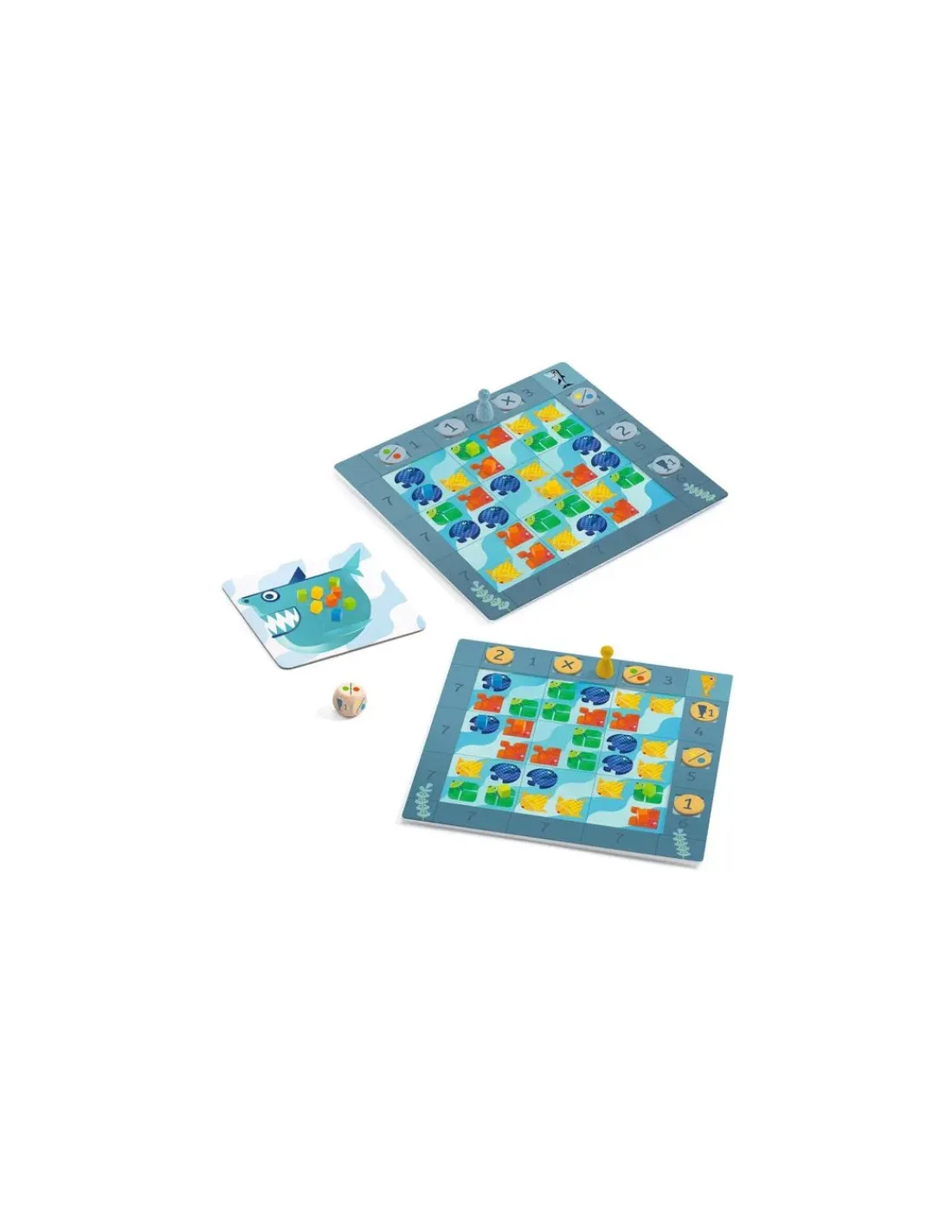 Papa requin embarquent ses petits dans une leçon de pêche. Qui sera le meilleur? A chaque tour de jeu, les jeunes squales attrapent 4 poissons mais tous ne pourront pas être conserver. À chacun de bien choisir afin de compléter un maximum de cases de son plateau.