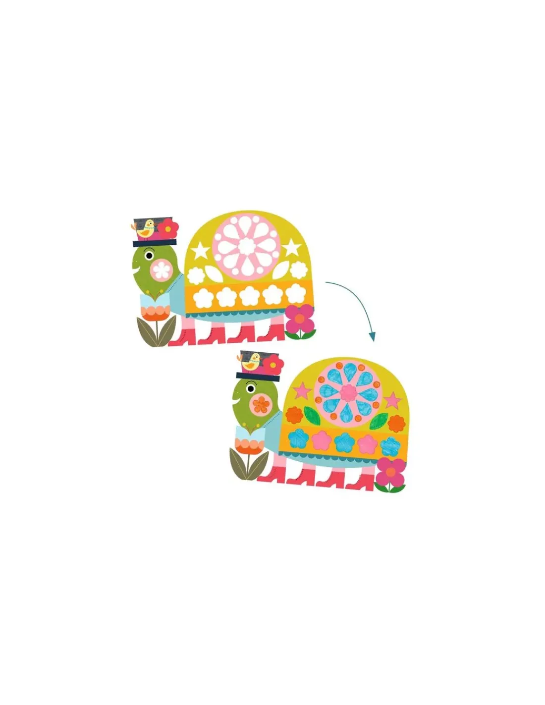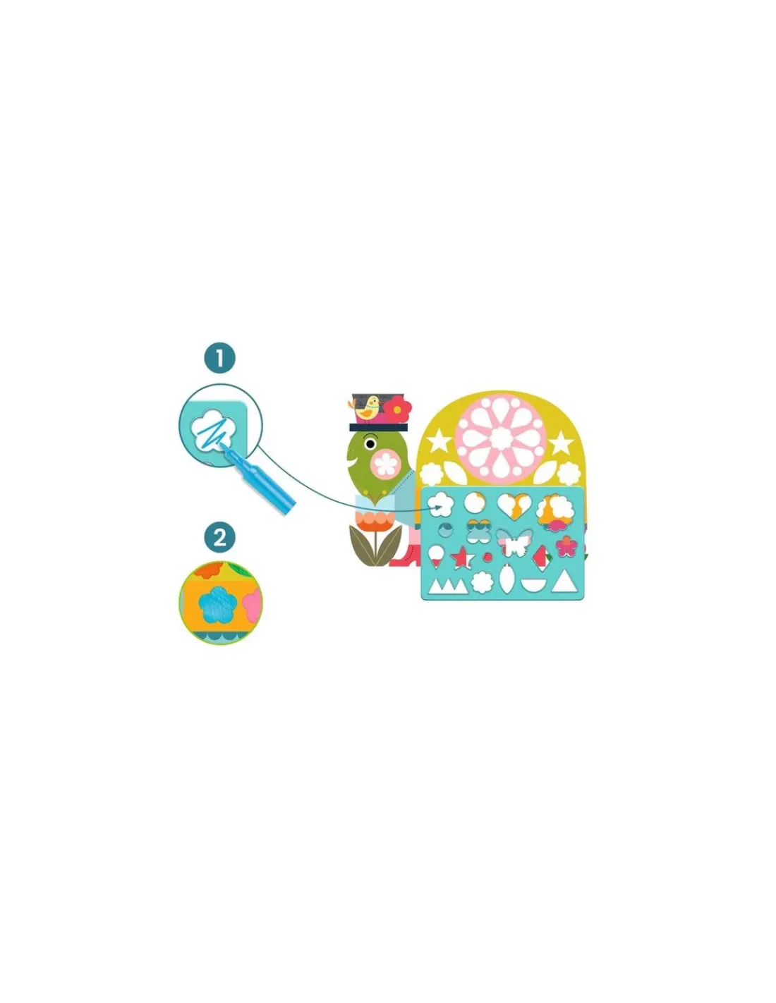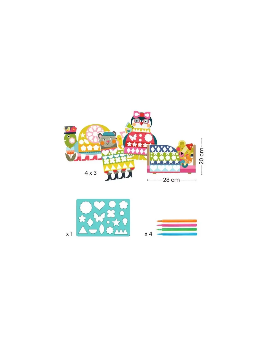 Le coffret contient 8 feuilles illustrées, 1 réglette guide translucide, 4 feutres à pointe fine et 1 livret explicatif pas-à-pas. Une activité créative, originale et ludique pour les enfants.
