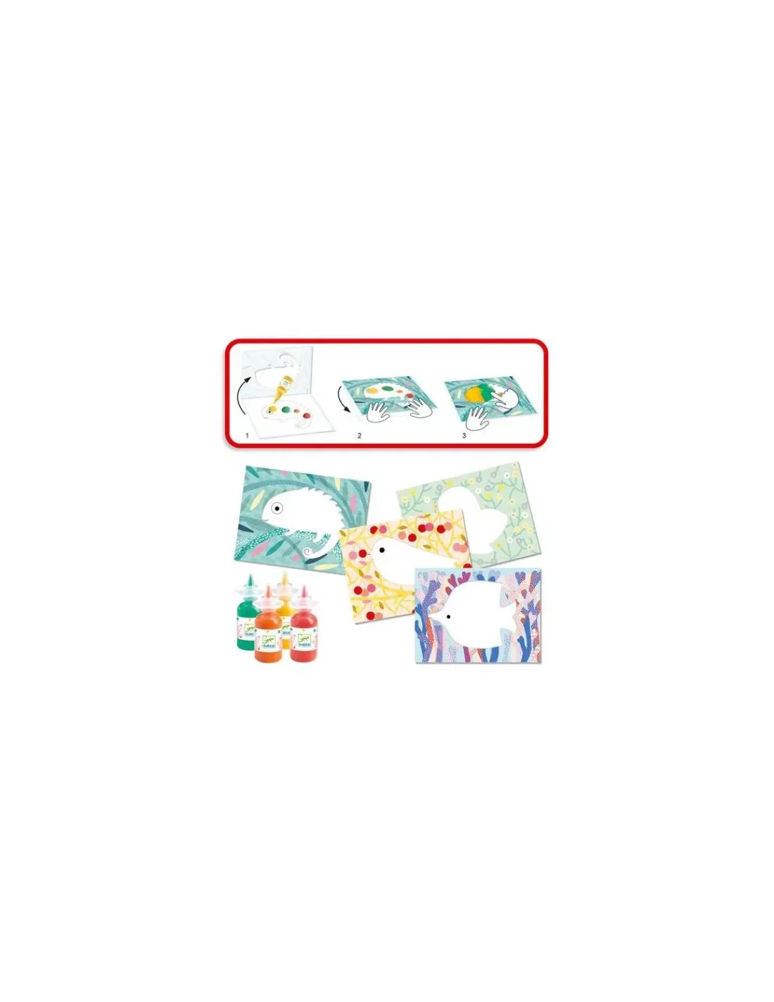 Ce coffret comprend 4 pochettes qui s’ouvrent, 4 bouteilles de peinture à l’eau et 1 livret explicatif pas à pas en couleurs.