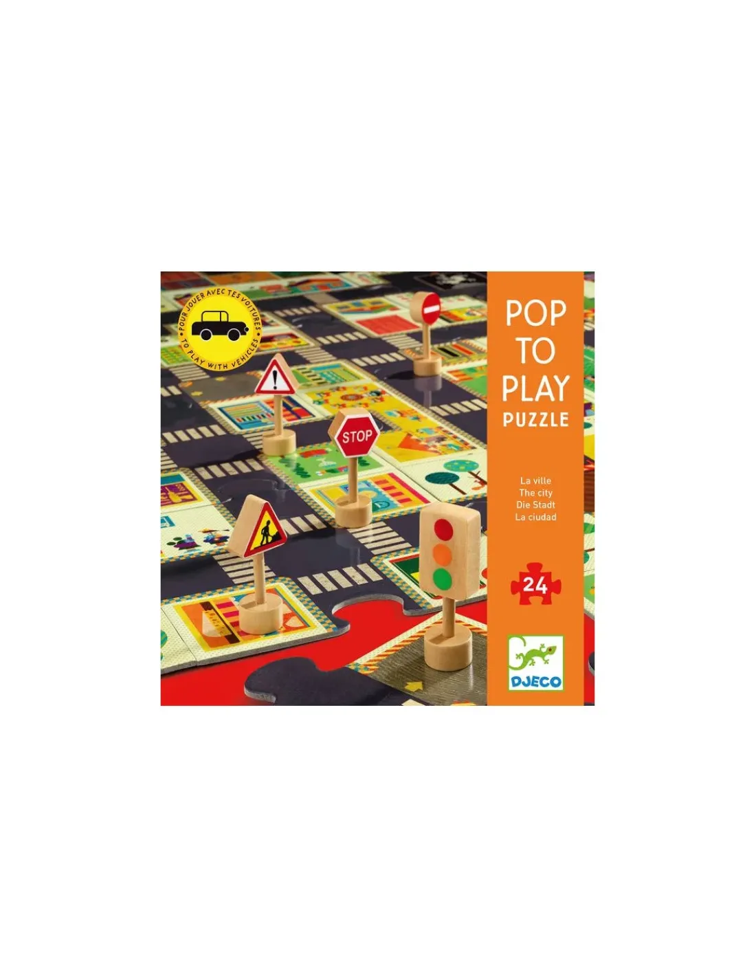 Découvrez le Pop to play La ville de Djeco, un puzzle géant dès 3 ans composé de 24 pièces et de 5 panneaux de signalisation en bois représentant une ville avec ses routes, ses parcs, ses maisons…