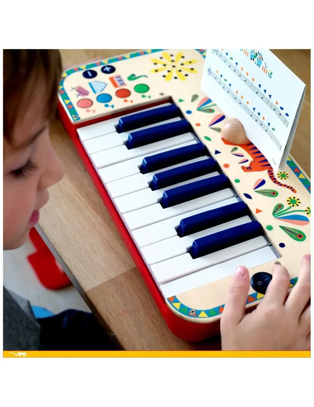 Ce joli synthétiseur électronique en bois et plastique est joliment illustré. Il est livré avec 2 partitions recto/verso : « Vive le vent », « Mary a un agneau noir », « Hymne à la joie » et « J’ai du bon tabac ». Très décoratif, il développera l’éveil musical de votre enfant.