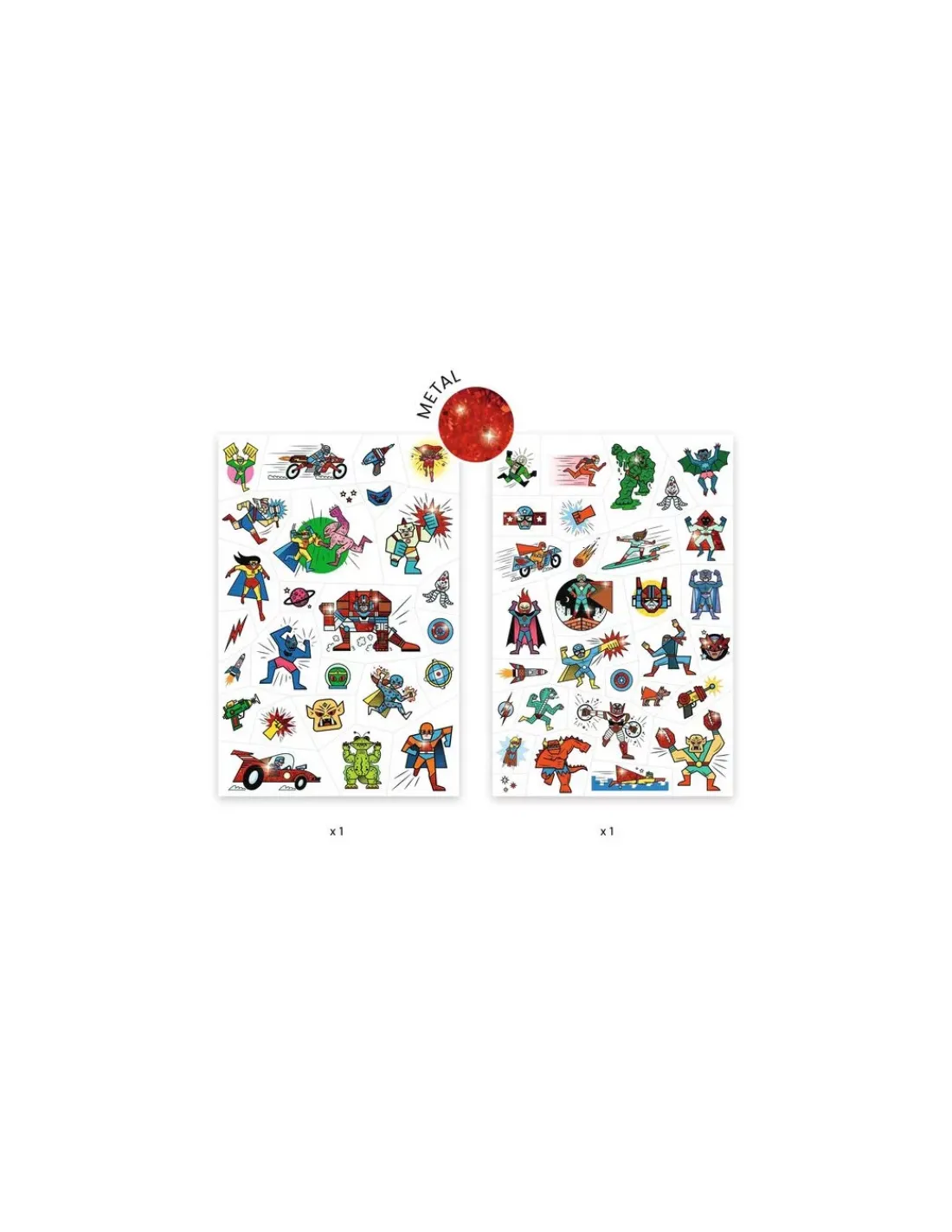 Deux planches de tatouages temporaires présentant des héros dotés de super pouvoirs et les méchants qu’ils affrontent. Pour le plus grand plaisir des enfants, ils sont parsemés de détails métallisés Faciles à utiliser, ils sont prédécoupés et s’appliquent avec un peu d’eau.