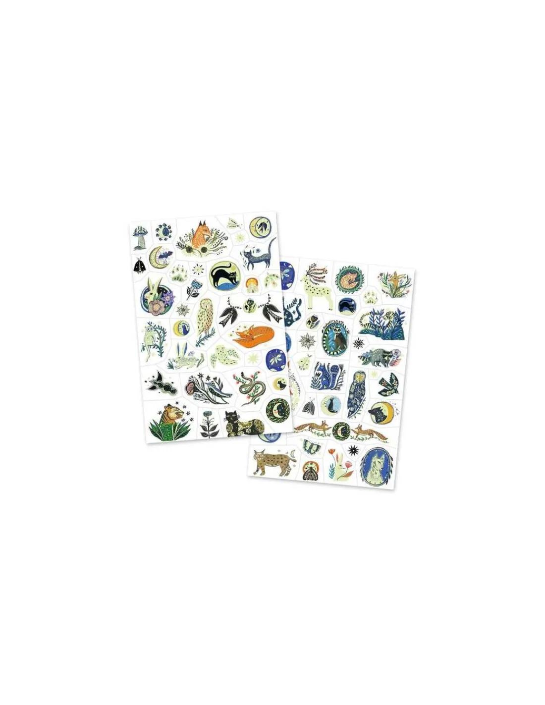 La pochette contient deux planches de tatouages uniques sur le thème de la nuit, mettant en scène d’adorables animaux et des motifs enchanteurs. Pour émerveiller les petits, des détails phosphorescents se révèlent dans l’obscurité, offrant une surprise lumineuse.