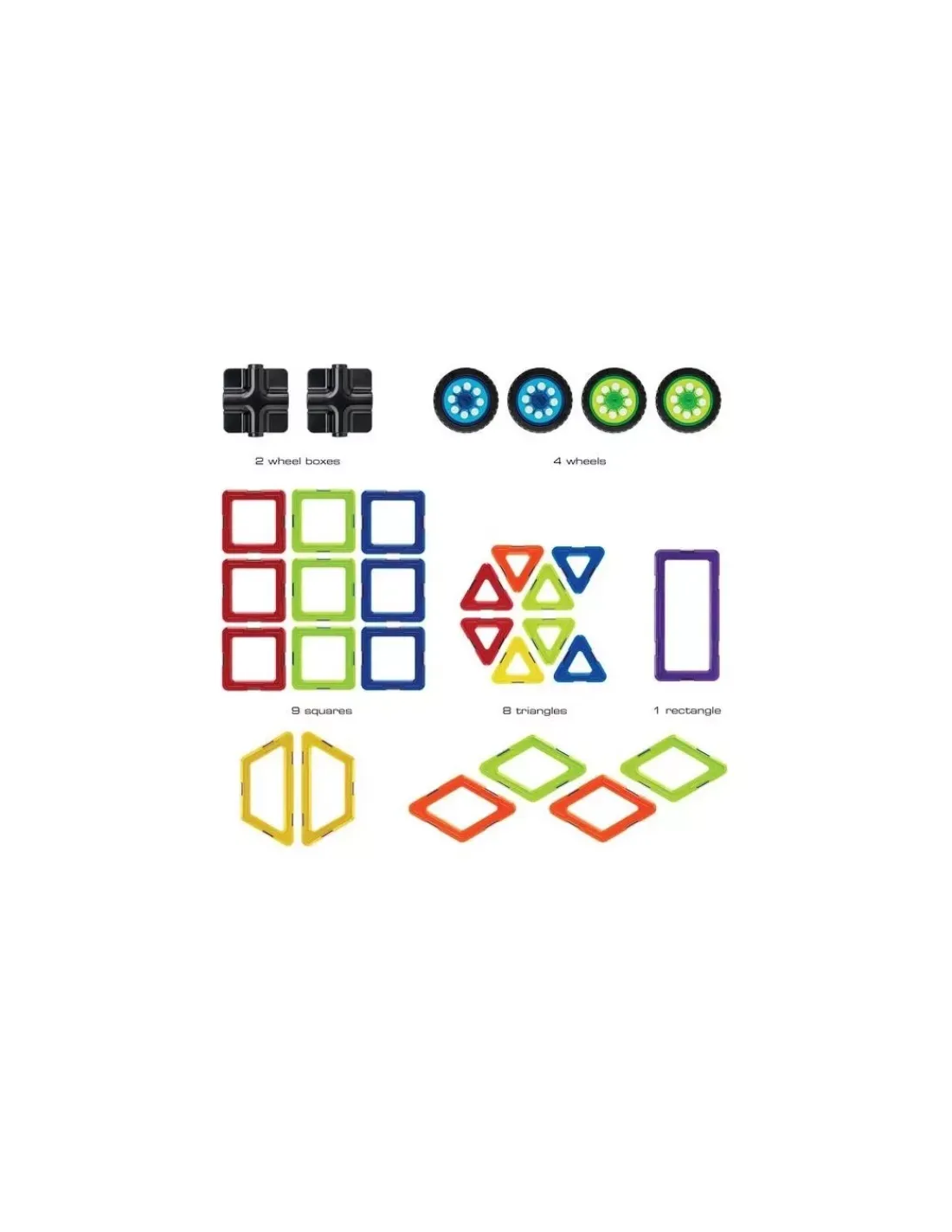 La boite contient 9 carrés, 8 triangles, 1 rectangle, 2 trapèzes, 4 losanges, 2 bas de caisse et 4 roues.