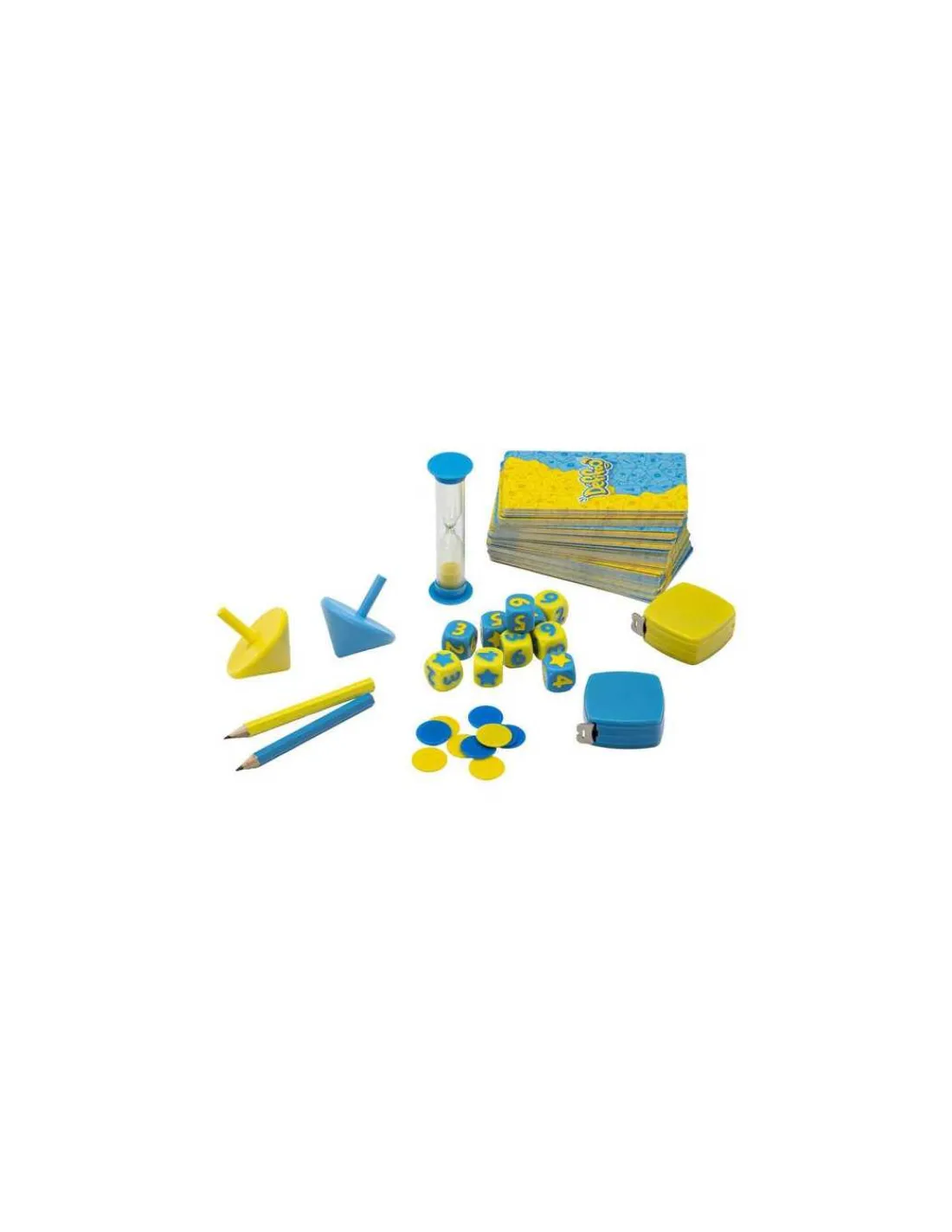 La boite de jeu contient 150 cartes « Défi », 10 dés, 10 puces, 2 toupies, 2 crayons, 2 blocs-notes, 2 mètres-rubans, 1 sablier de 30 secondes et la règle du jeu.