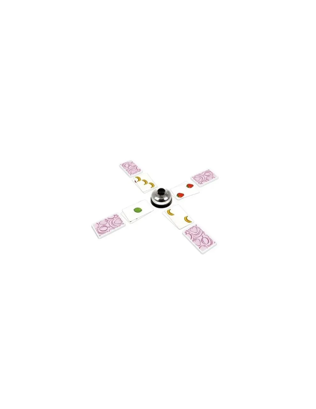 Une grande macédoine de fruit avec bananes, fraises, citrons et pruneaux. Chaque joueur change à son tour ce mélange, mais attention : dès qu’il y a 5 fruits identiques visibles sur la table, on fait tinter la sonnette