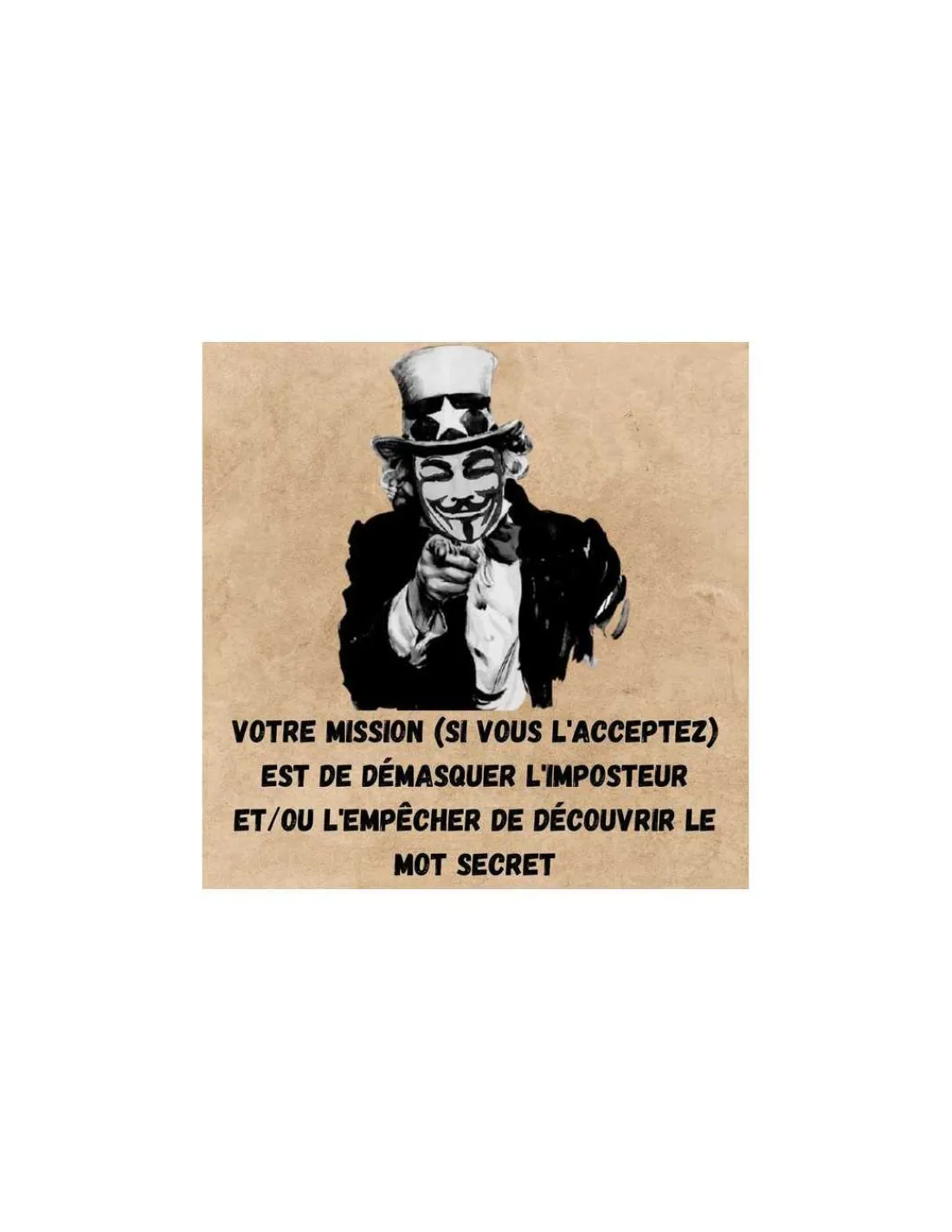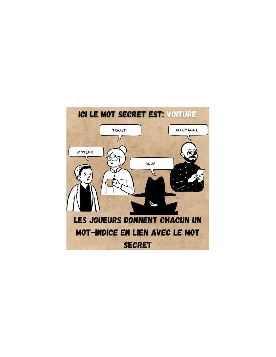 Chaque joueur connaît un mot secret sauf l’Imposteur, qui doit deviner ce mot en s’appuyant sur les indices fournis par les autres joueurs sans se faire démasquer. La partie s’achève lorsque l’Imposteur est identifié ou échappe à la détection, et peut se prolonger sur plusieurs manches.