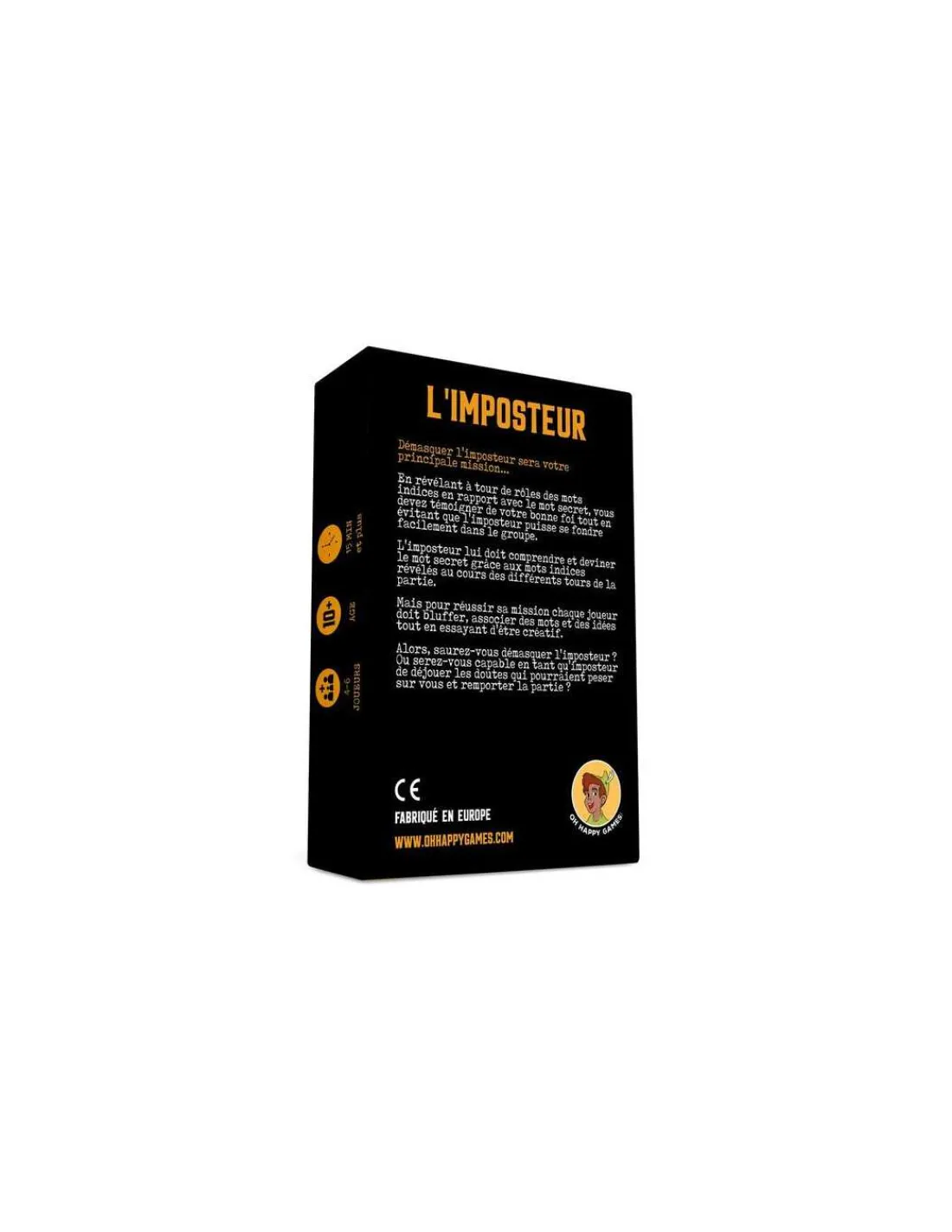 Découvrez L’Imposteur de l’éditeur Oh Happy Games, un jeu d’ambiance pour jouer de 4 à 6 joueurs à partir de 10 ans. Un jeu de bluff, de suspicion et d’association de mots, dans lequel vous devrez démasquer l’intrus parmi vous… à moins que ce ne soit vous?