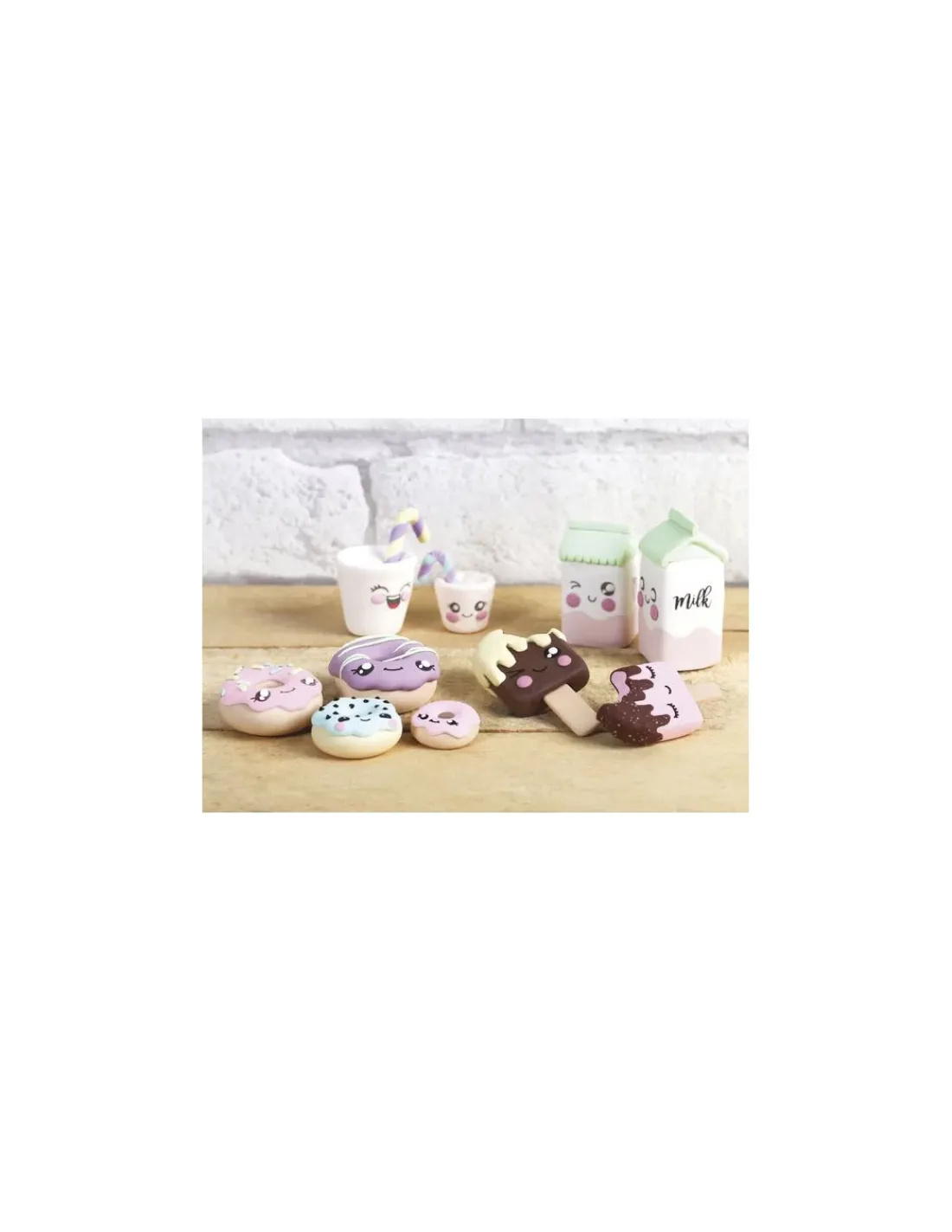 Dans une mallette de rangement, retrouvez tout le nécessaire pour réaliser des donuts, des glaces, des briques et des verres de lait avec des yeux trop mignons!
