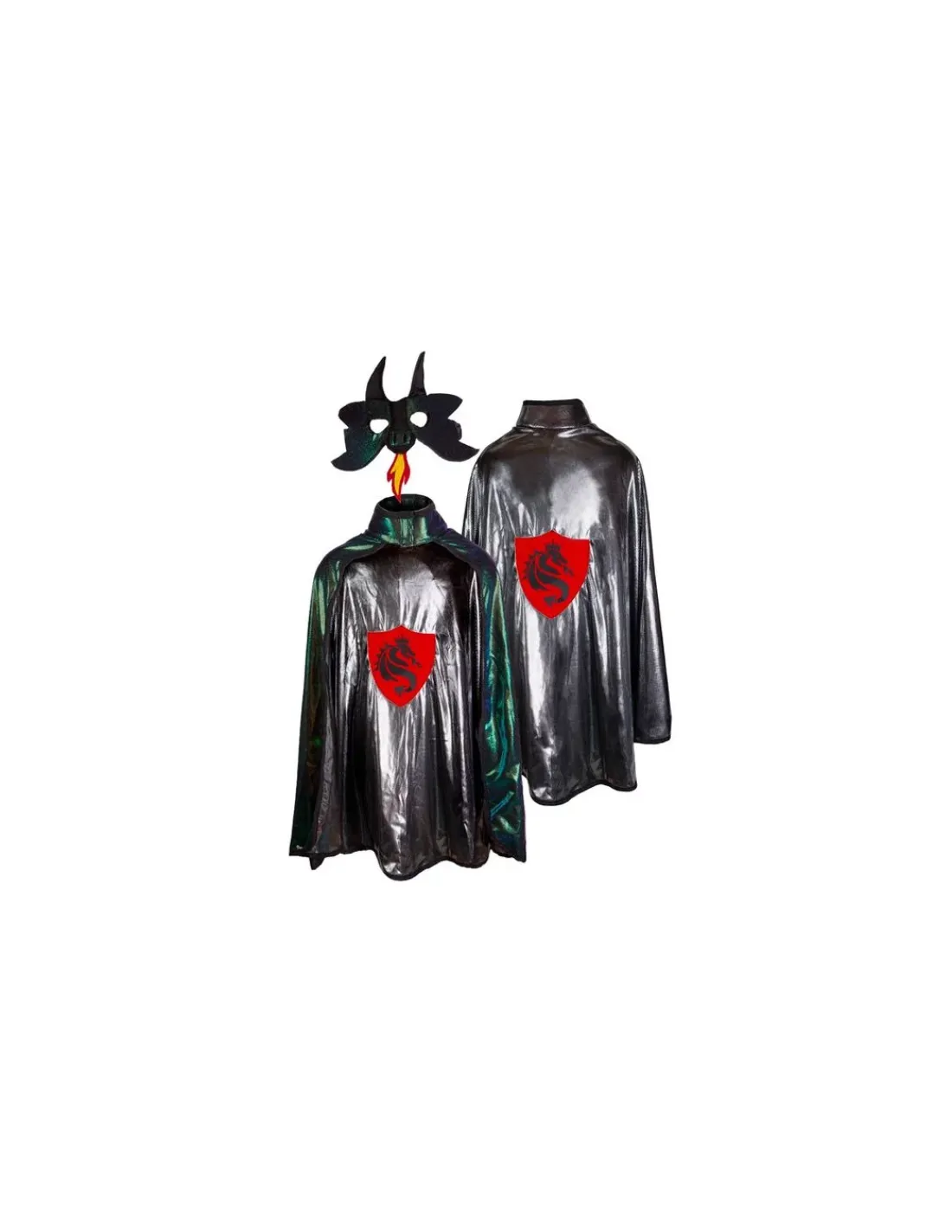 Une cape réversible avec un masque fait d’un beau tissu de qualité très soyeux et qui présente un imprimé métallisé irisé d’un côté et un imprimé argenté/noir de l’autre. Il y a des pointes de feutre rouge du côté du dragon et un emblème de bouclier rouge du côté du chevalier.