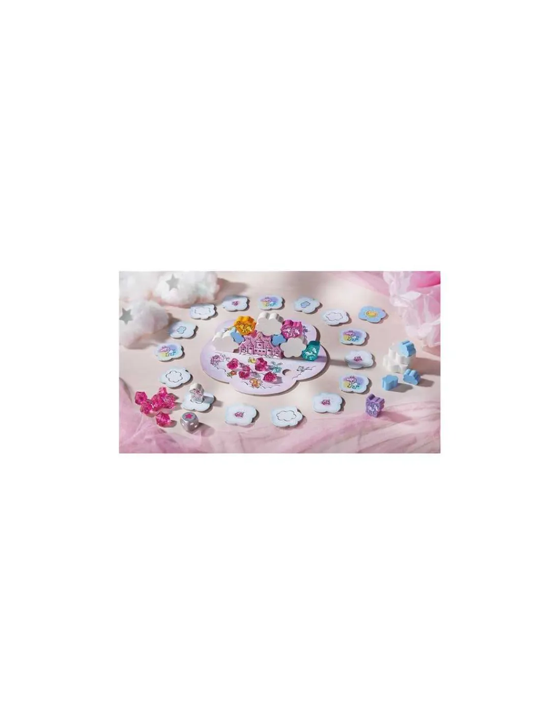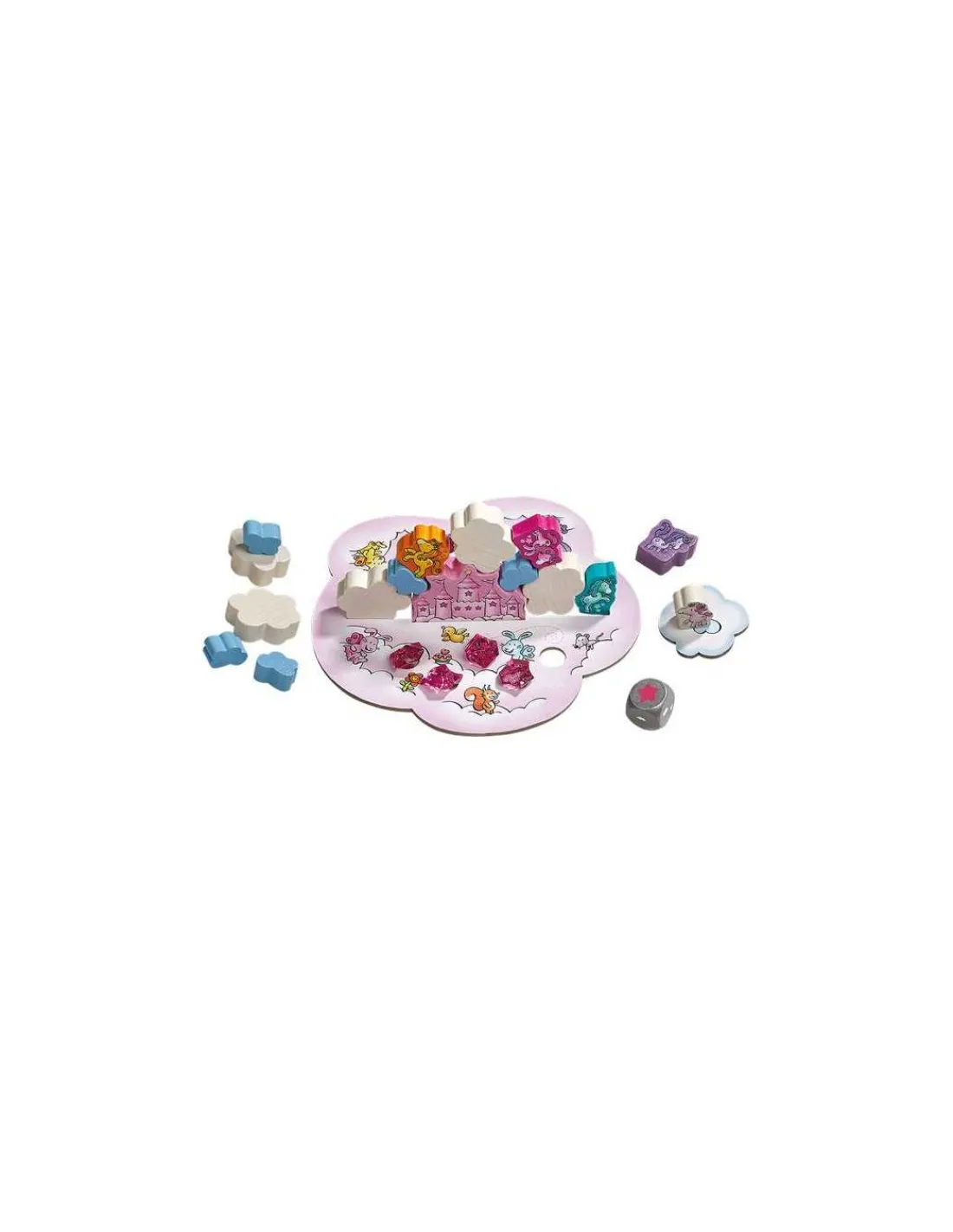 Lancez le dé et déplacez Rosalie, le bébé licorne, sur les tuiles « Nuage » qui entourent le château. Selon le type de nuage où elle atterrit, prenez un gros nuage blanc, un petit nuage bleu ou une licorne et empilez-là sur ou contre le château. Si vous parvenez à empiler tous les éléments, tout le monde gagne la partie! Attention, si tu fais tomber des éléments, retourne des tuiles « Nuage », si un orage apparait pour une troisième fois, tout le monde perd!