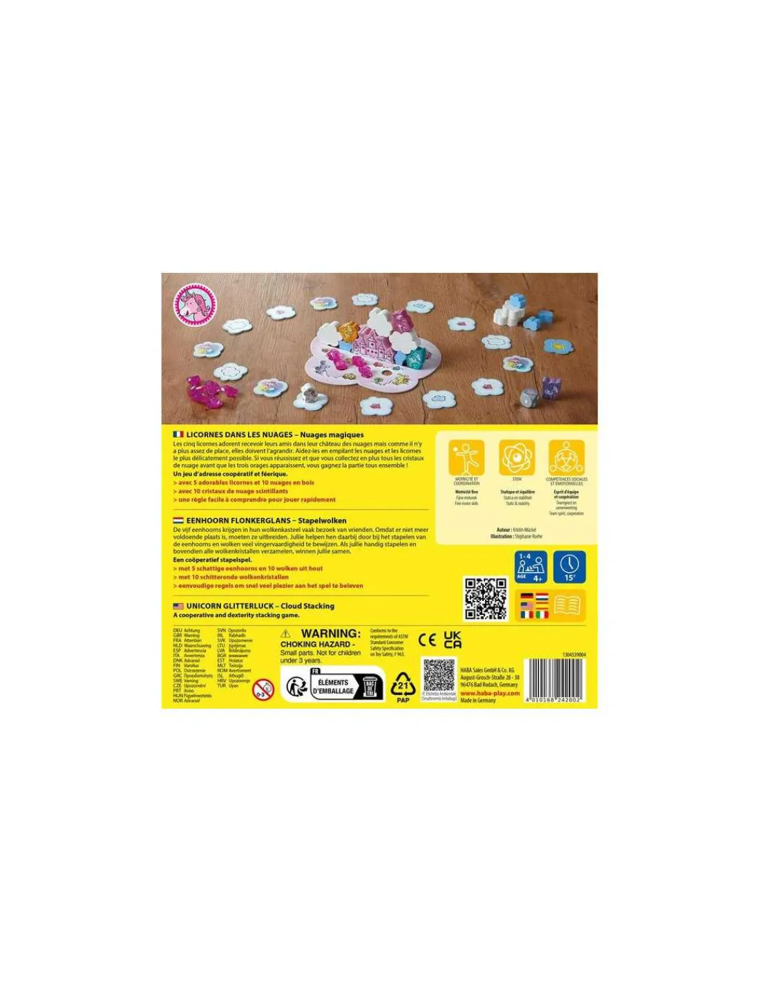Découvrez le jeu Licornes dans les nuages Nuages Magiques de Haba, un jeu d’adresse coopératif et féerique pour les enfants dès 4 ans.