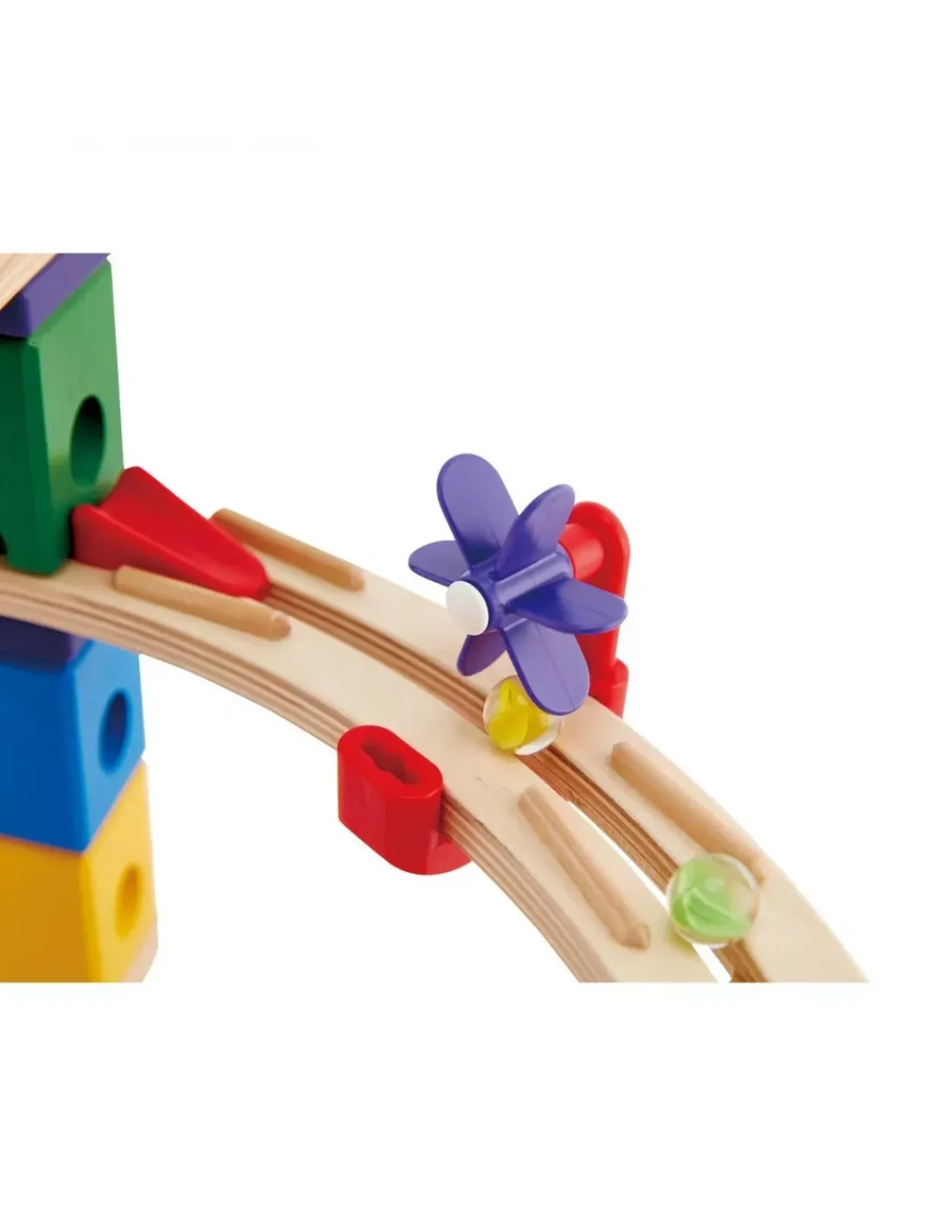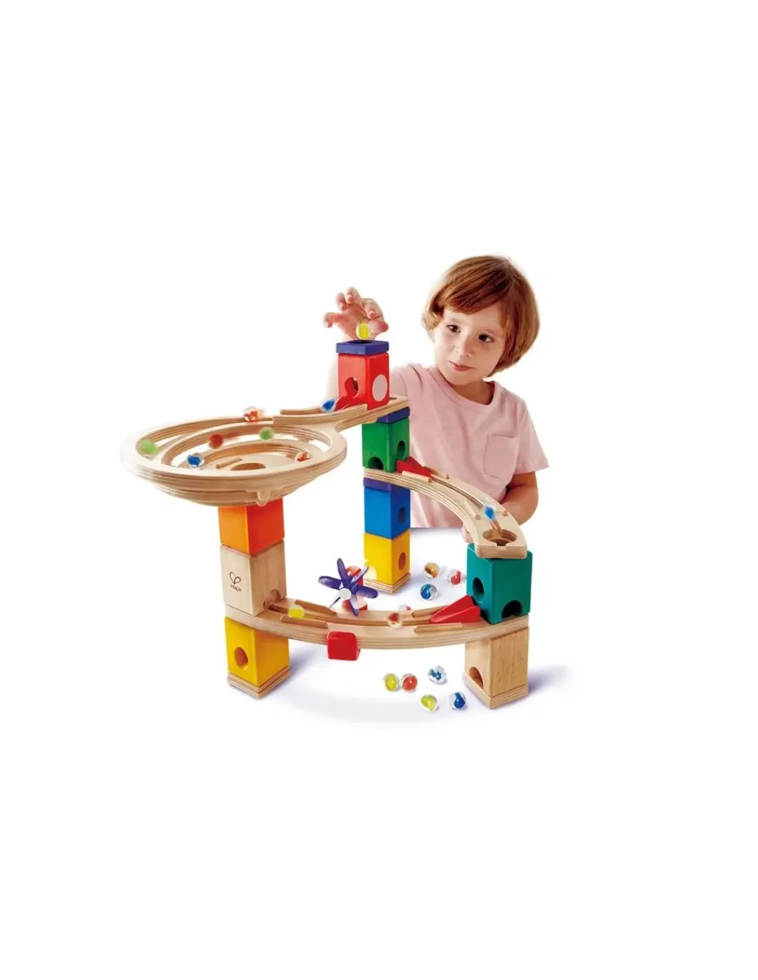 Découvrez le circuit de billes Race to the finish de Hape, un jeu de construction de la gamme Quadrilla, un circuit à billes de 28 pièces et 30 billes pour les enfants à partir de 4 ans.