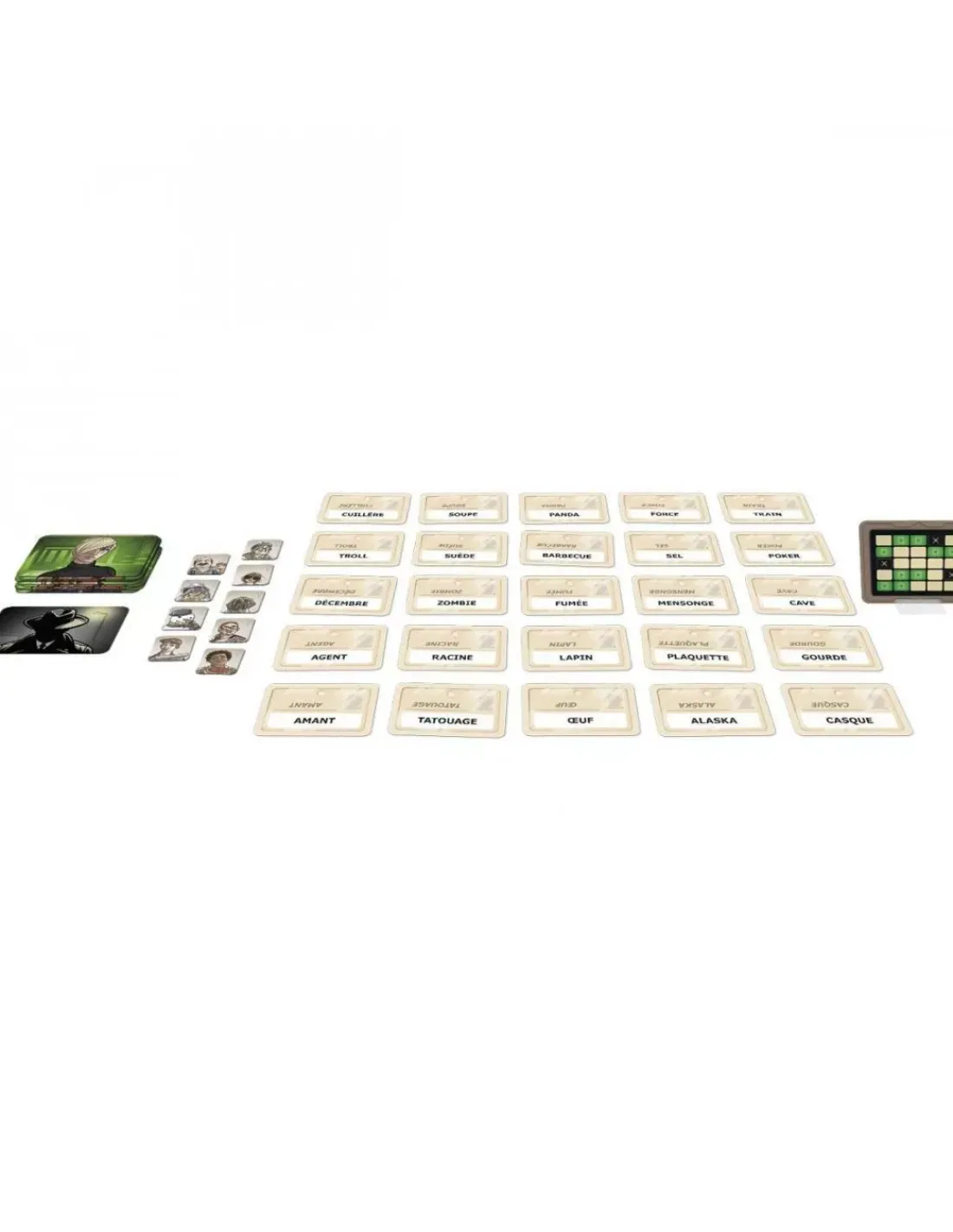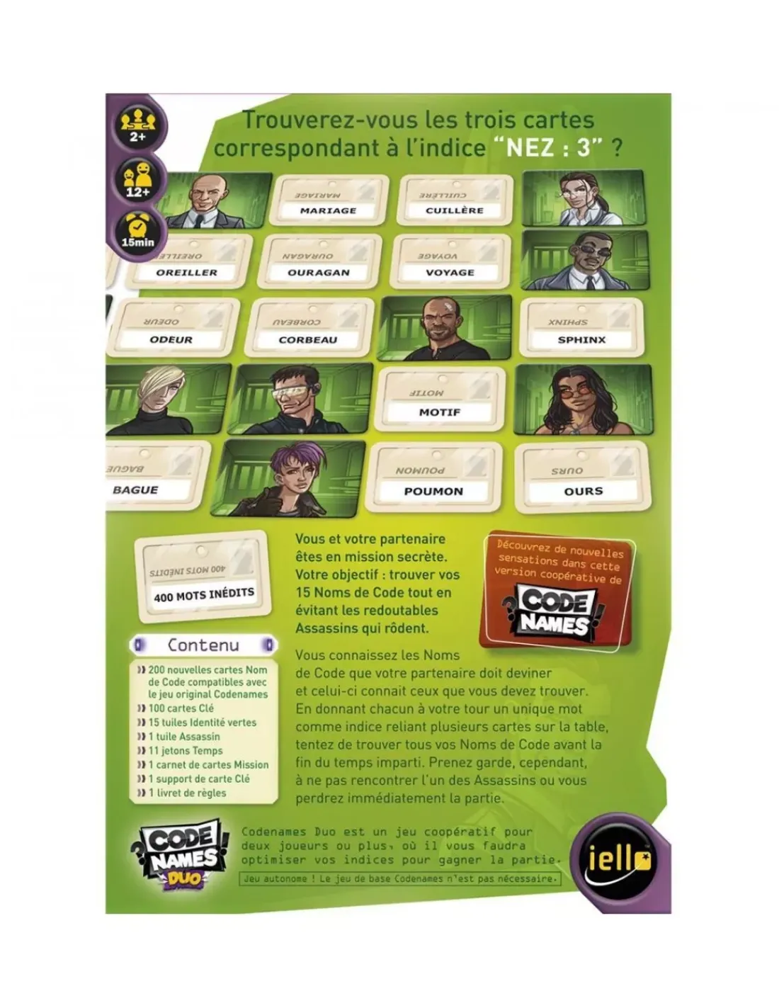 Ce jeu contient 200 nouvelles cartes Nom de Code compatibles avec le jeu original Codenames, 100 cartes Clé, 15 tuiles Identité vertes, 1 tuile Assassin, 11 jetons, Temps, 1 carnet de cartes Mission, 1 support de carte Clé et les règles du jeu.
