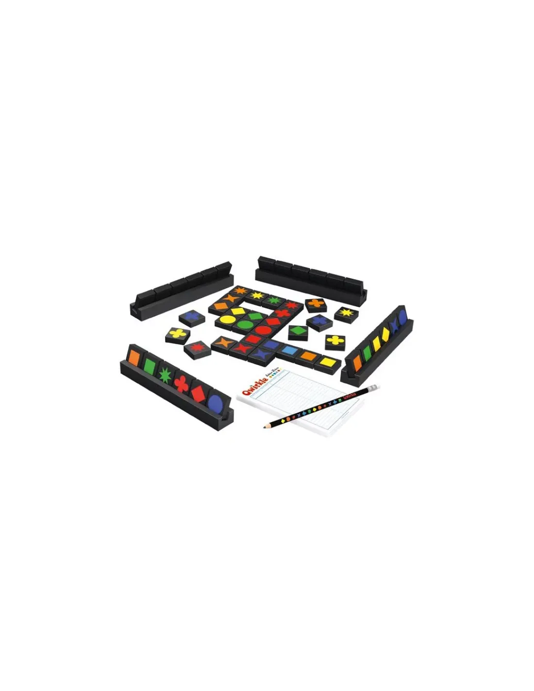 Ce jeu contient 108 tuiles en bois, 1 sac en tissu, 4 chevalets en bois, 1 bloc de feuilles de score et 1 crayon Qwirkle et 1 livret de règles.